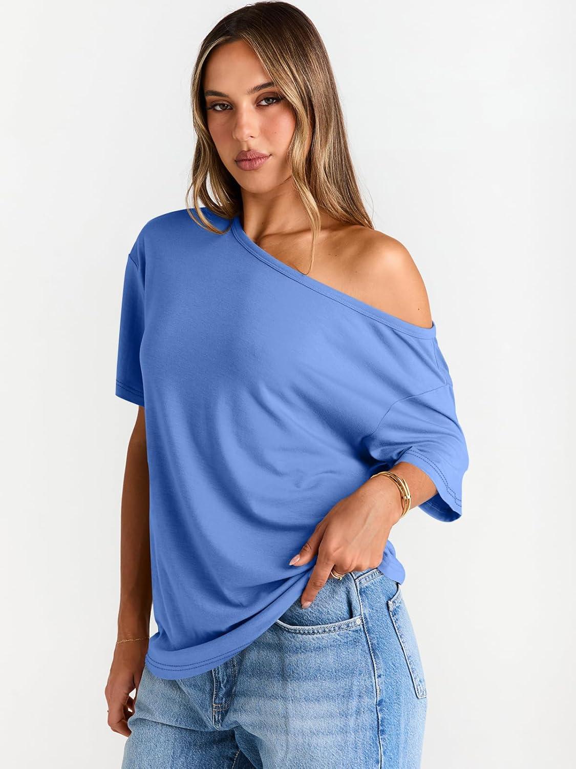 Trendy Queen Womens Off The Shoulder Tops Oversized T-Shirts Short Sleeve Tees Summer 2025 Casual Spring Fashion Clothes(Skyblue)