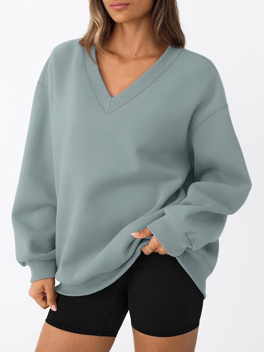 Trendy Queen Womens Oversized Sweatshirts Fall Fashion V Neck Hoodies Loose Fit Winter Outfits Teen Girl Clothes 2025(Greygreen)