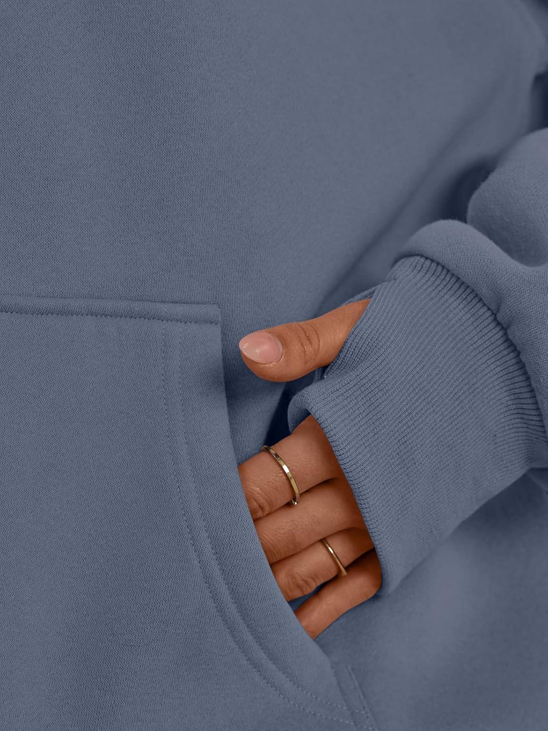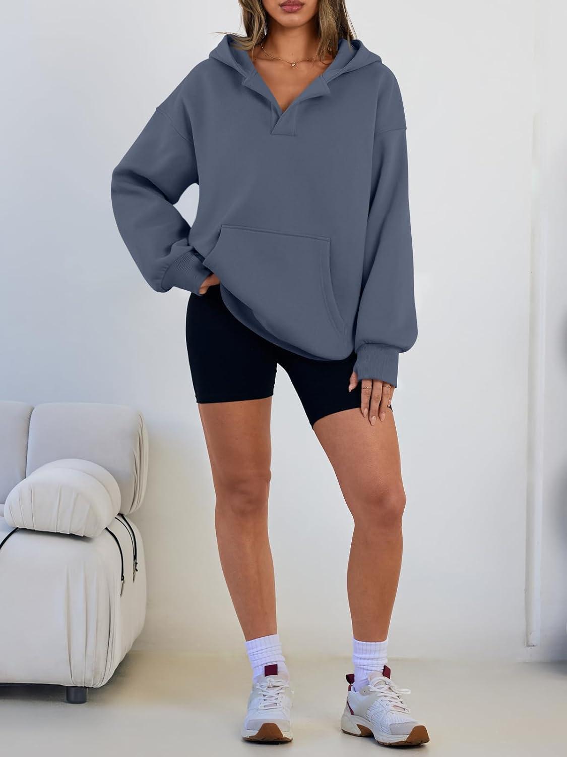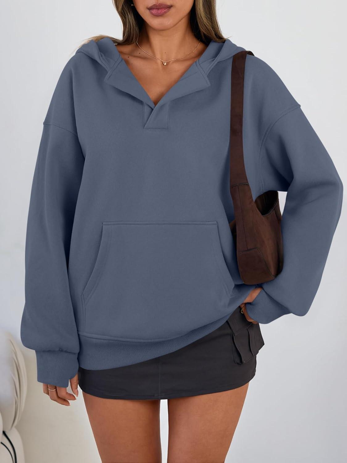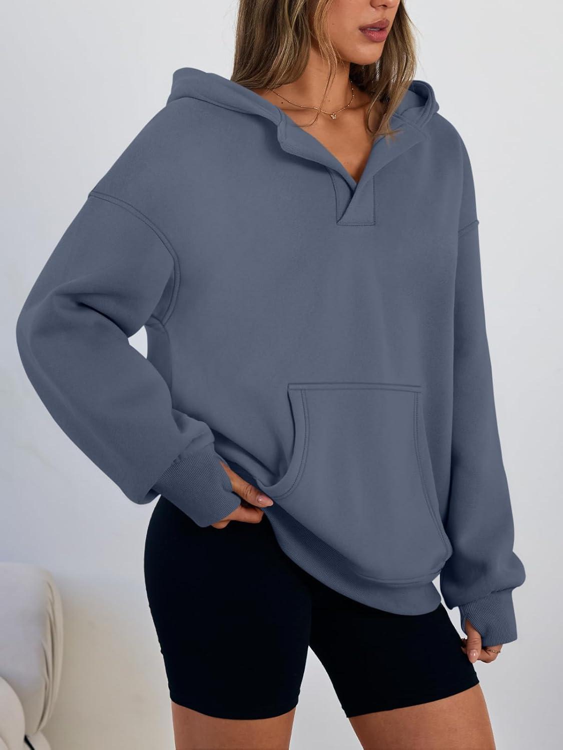 Trendy Queen Womens Oversized V Neck Hoodies with Thumb Hole Pullover Sweatshirts Y2k Clothes Fall Fashion Outfits 2025(Greyblue)
