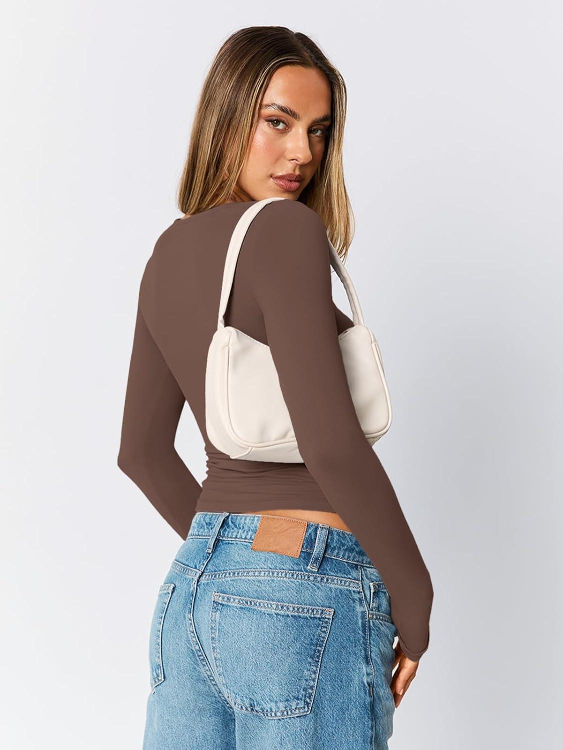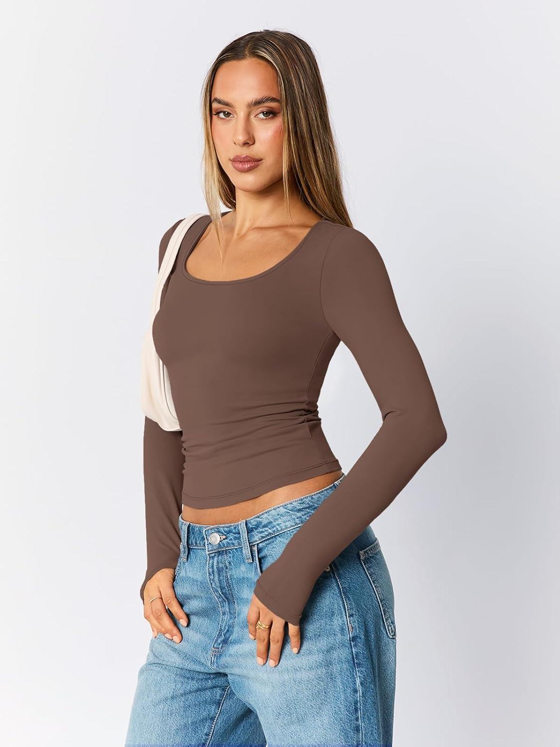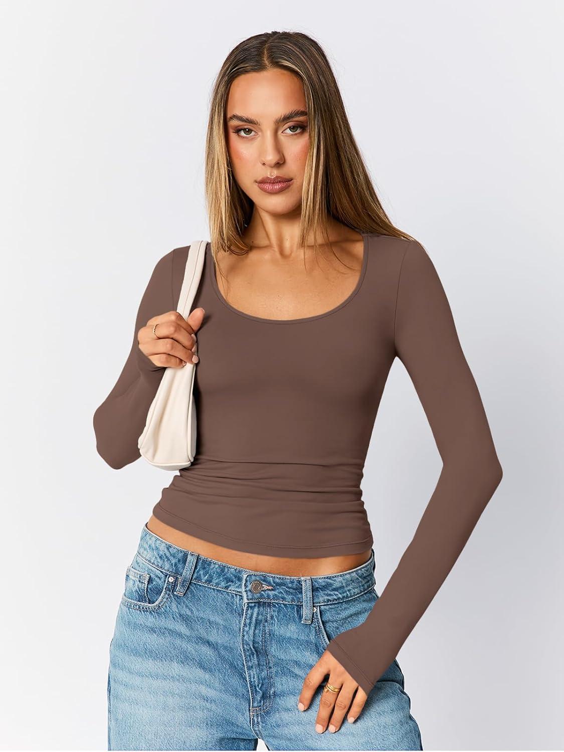 Trendy Queen Womens Scoop Neck Long Sleeve Shirts Skinny Going Out Crop Tops Cute Fall Fashion 2025 Clothes(Coffee)