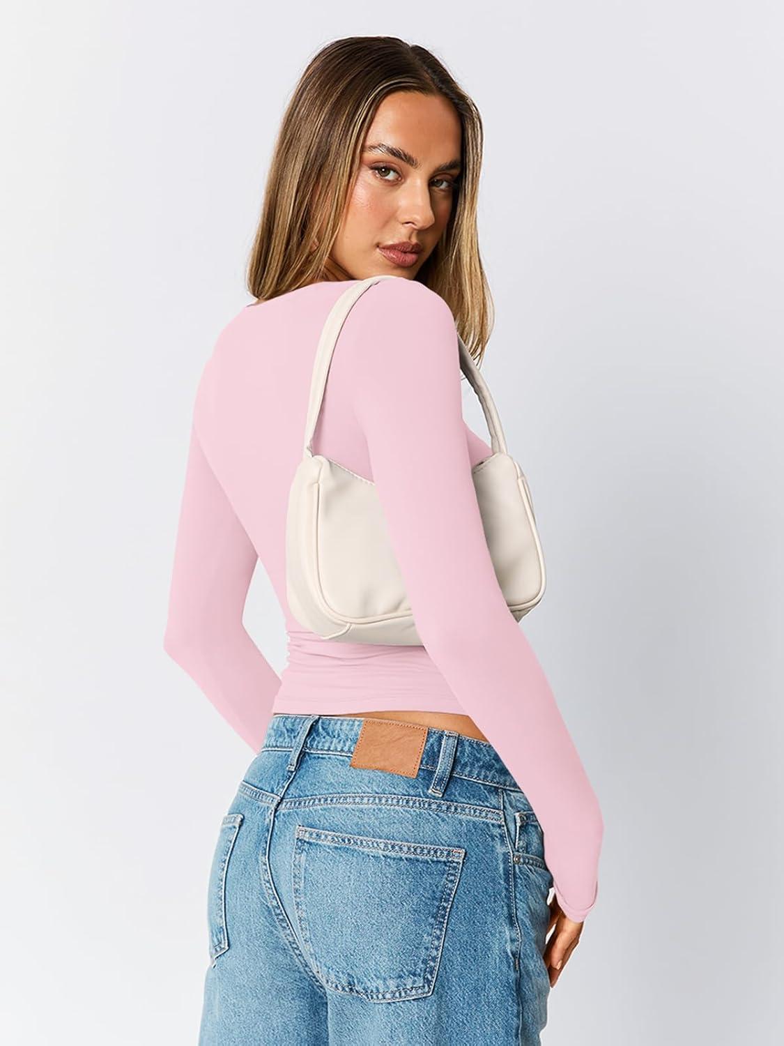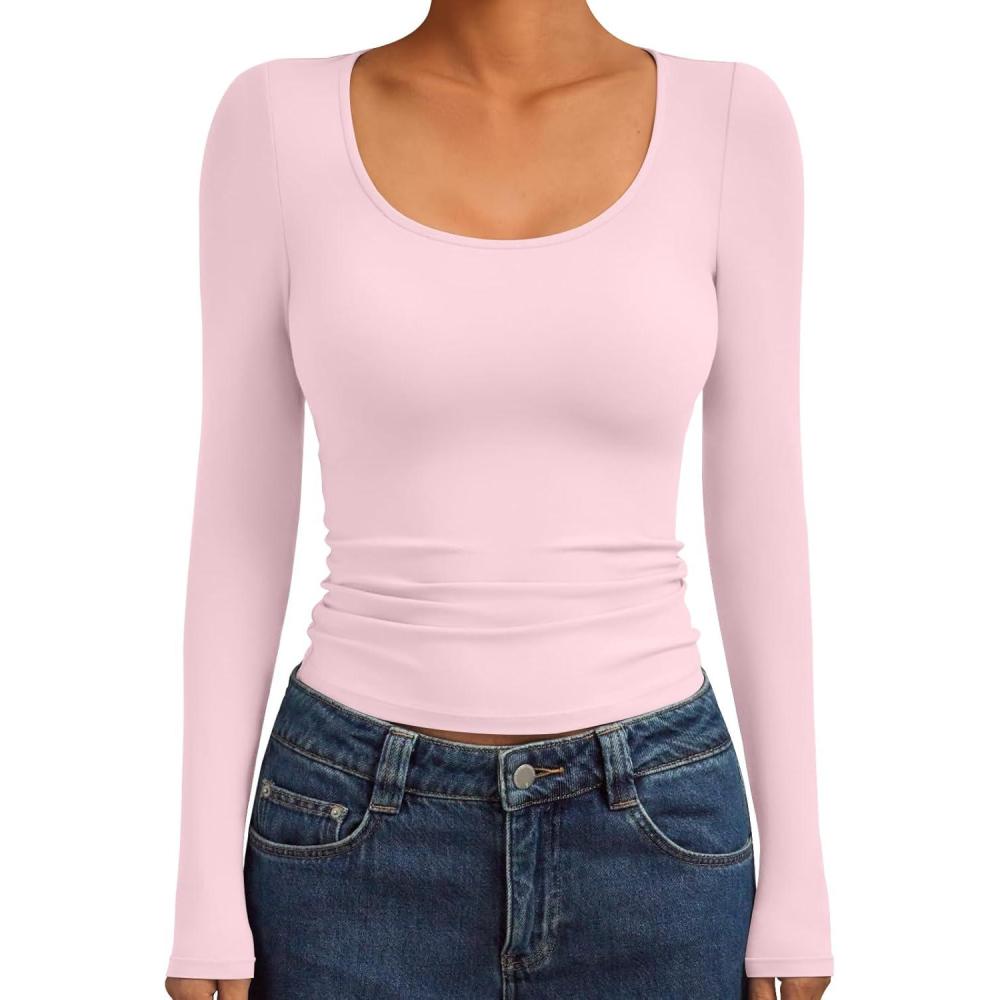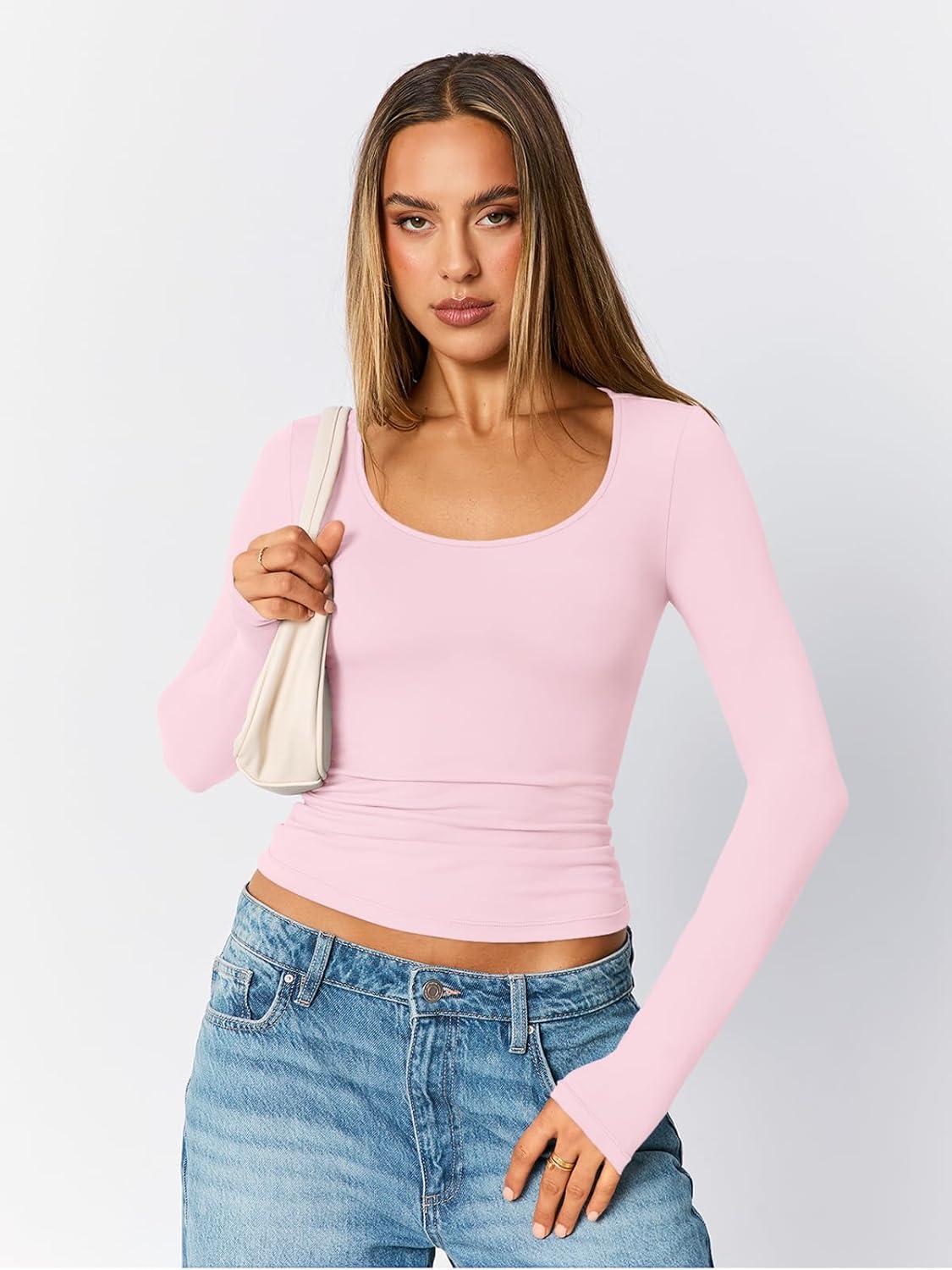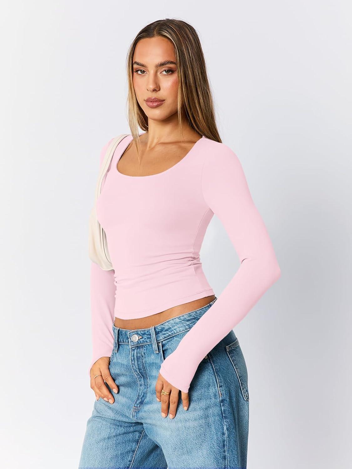 Trendy Queen Womens Scoop Neck Long Sleeve Shirts Skinny Going Out Crop Tops Cute Fall Fashion 2025 Clothes(Pink)