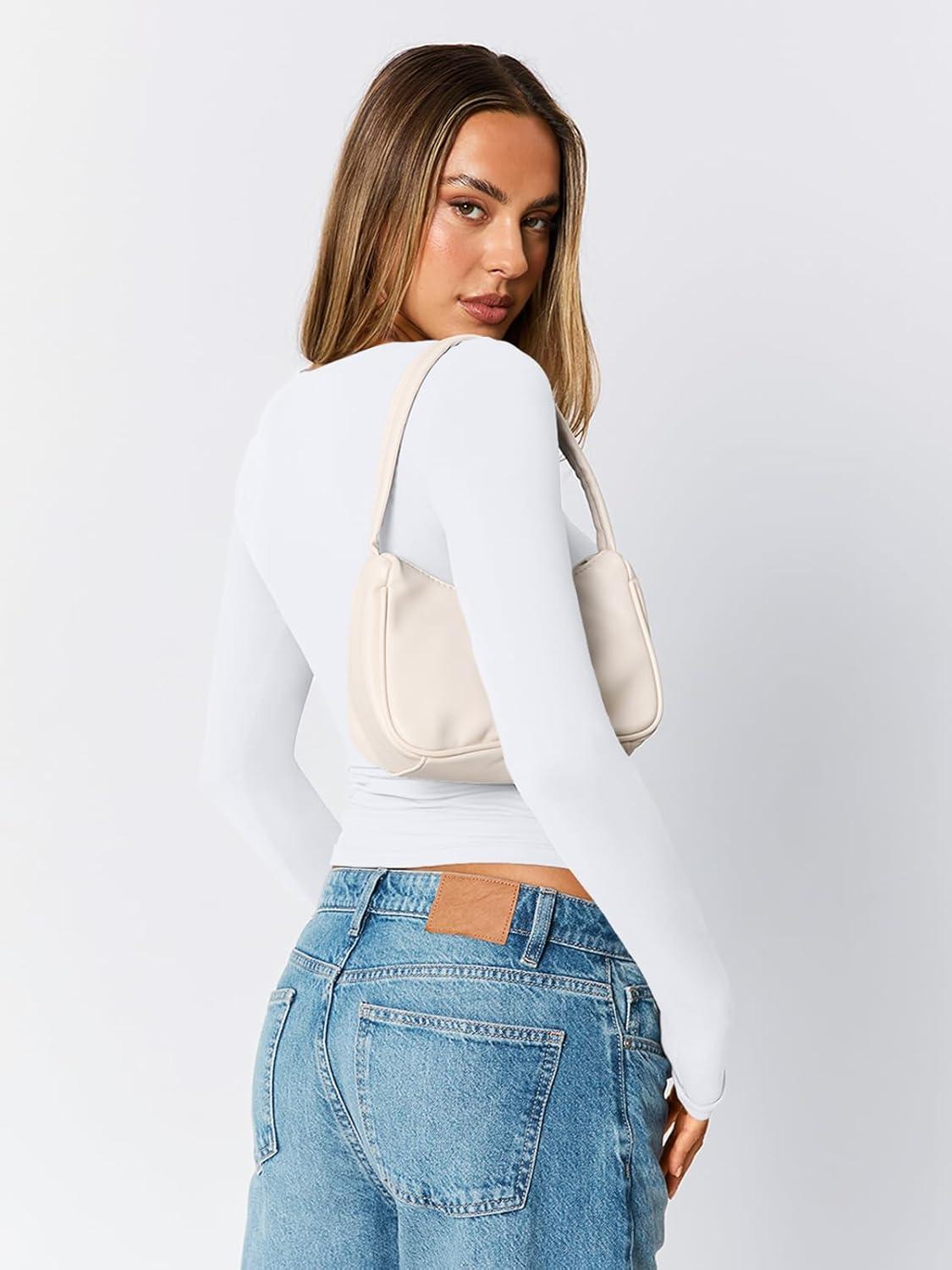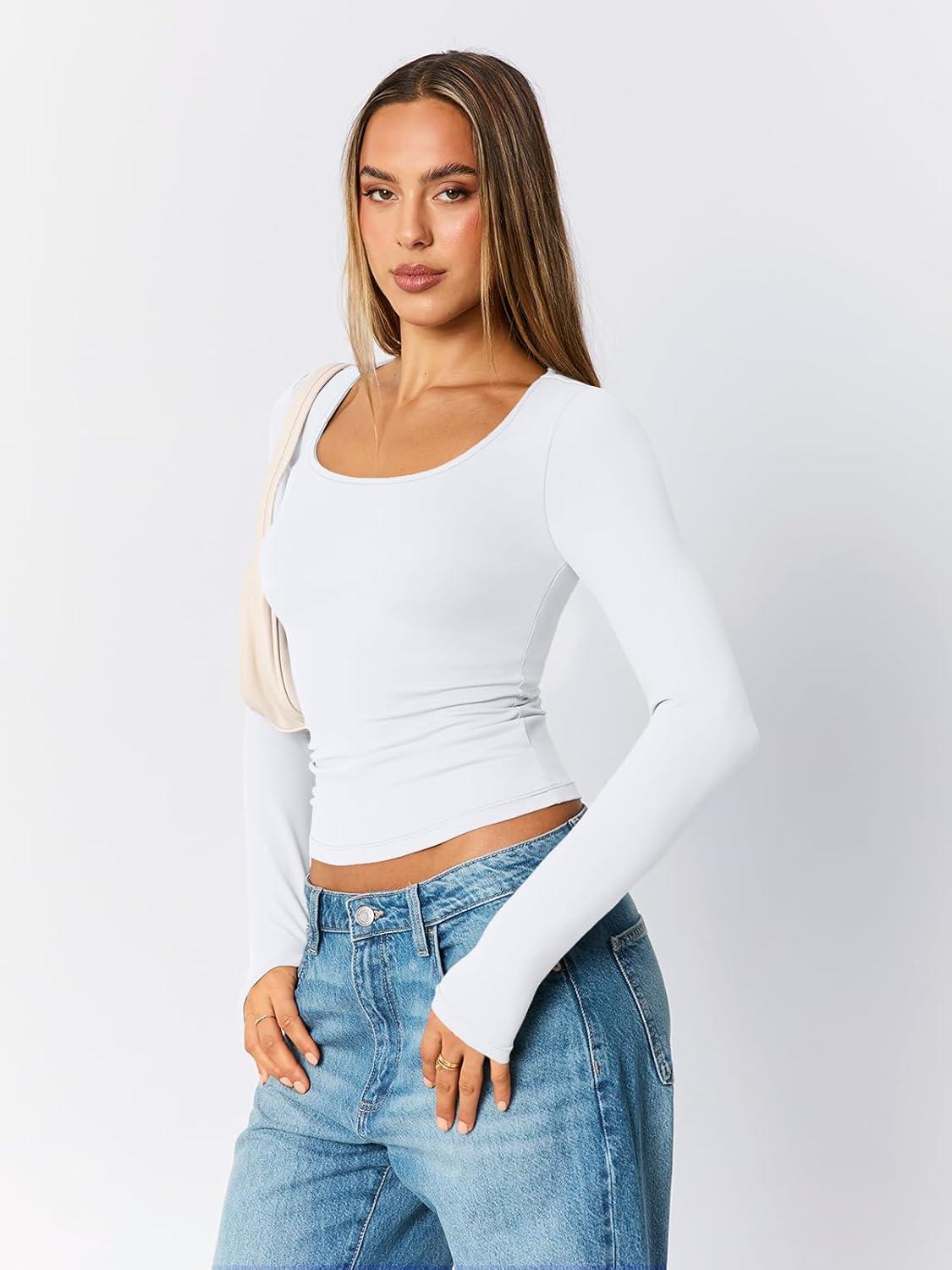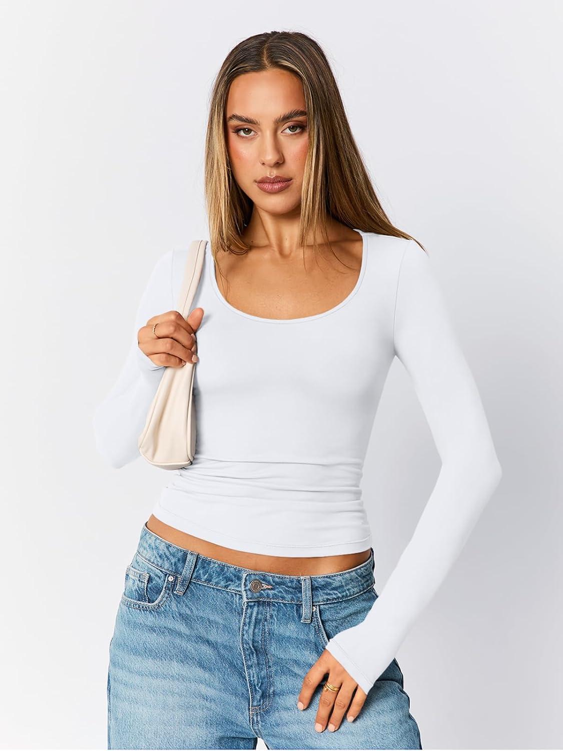 Trendy Queen Womens Scoop Neck Long Sleeve Shirts Skinny Going Out Crop Tops Cute Fall Fashion 2025 Clothes(White)
