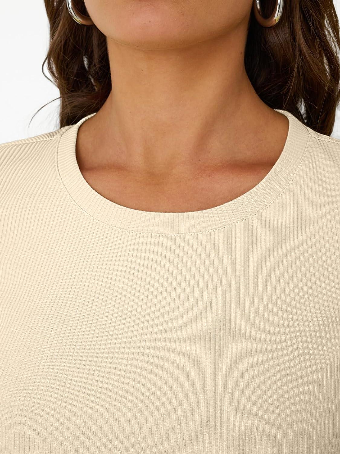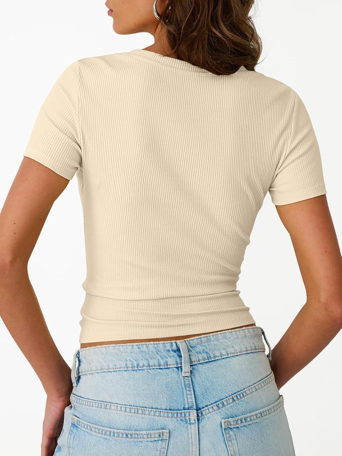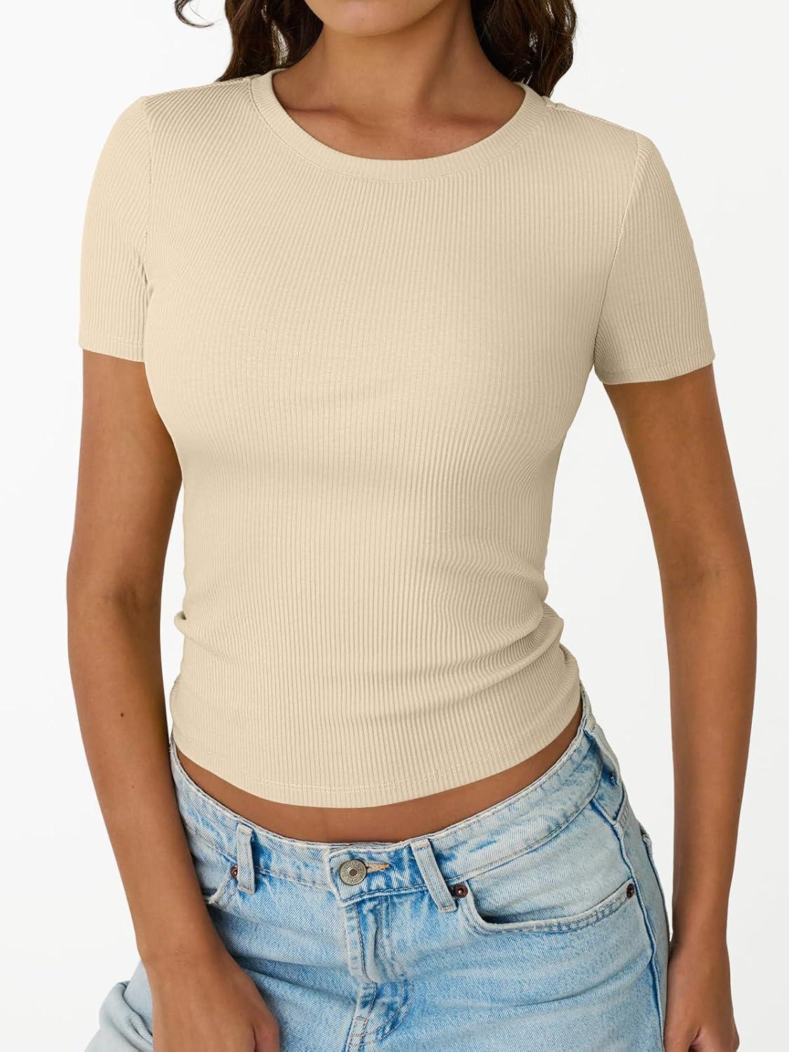 Trendy Queen Womens Short Sleeve Shirts Crewneck Ribbed Knit Slim Fitted T-Shirt Summer Basic Tee 2025 Tops(Beige)