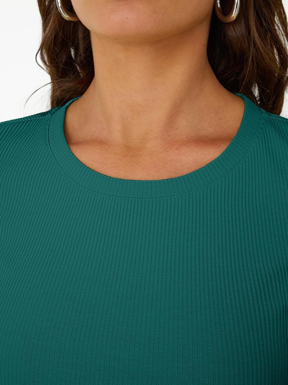 Trendy Queen Womens Short Sleeve Shirts Crewneck Ribbed Knit Slim Fitted T-Shirt Summer Basic Tee 2025 Tops(Forest Green)
