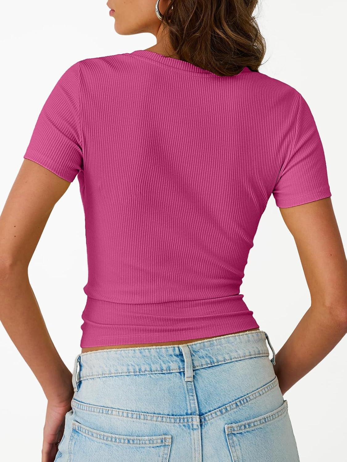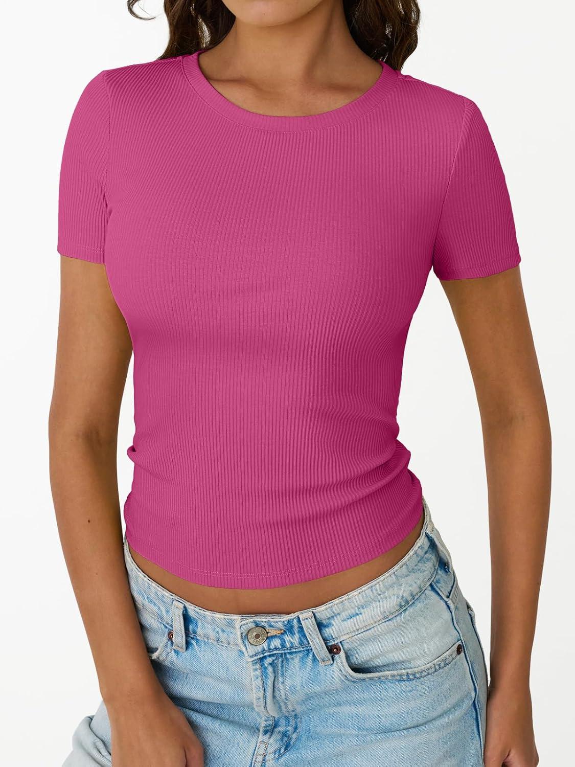 Trendy Queen Womens Short Sleeve Shirts Crewneck Ribbed Knit Slim Fitted T-Shirt Summer Basic Tee 2025 Tops(Hot Pink)