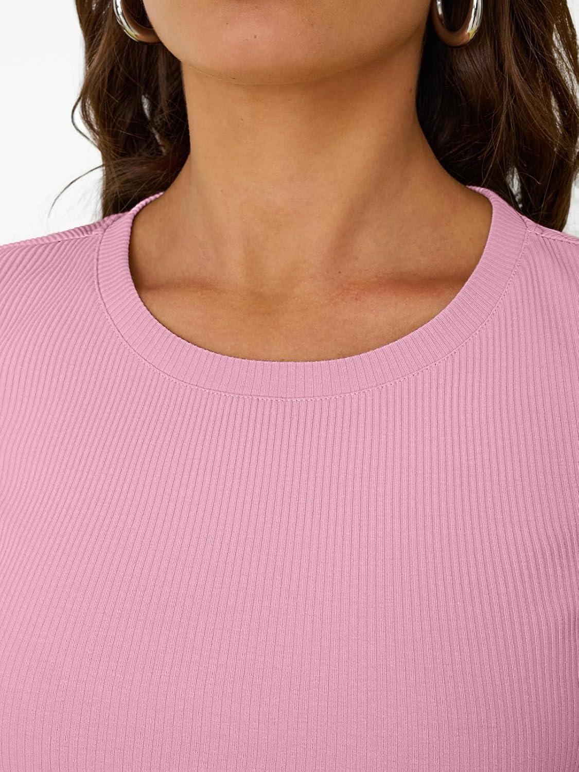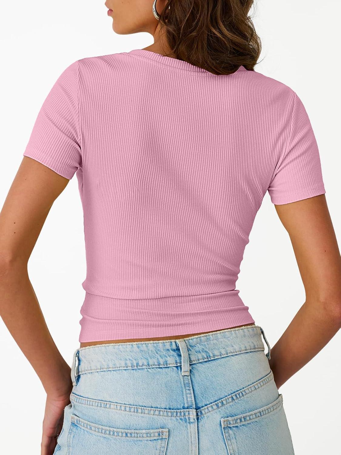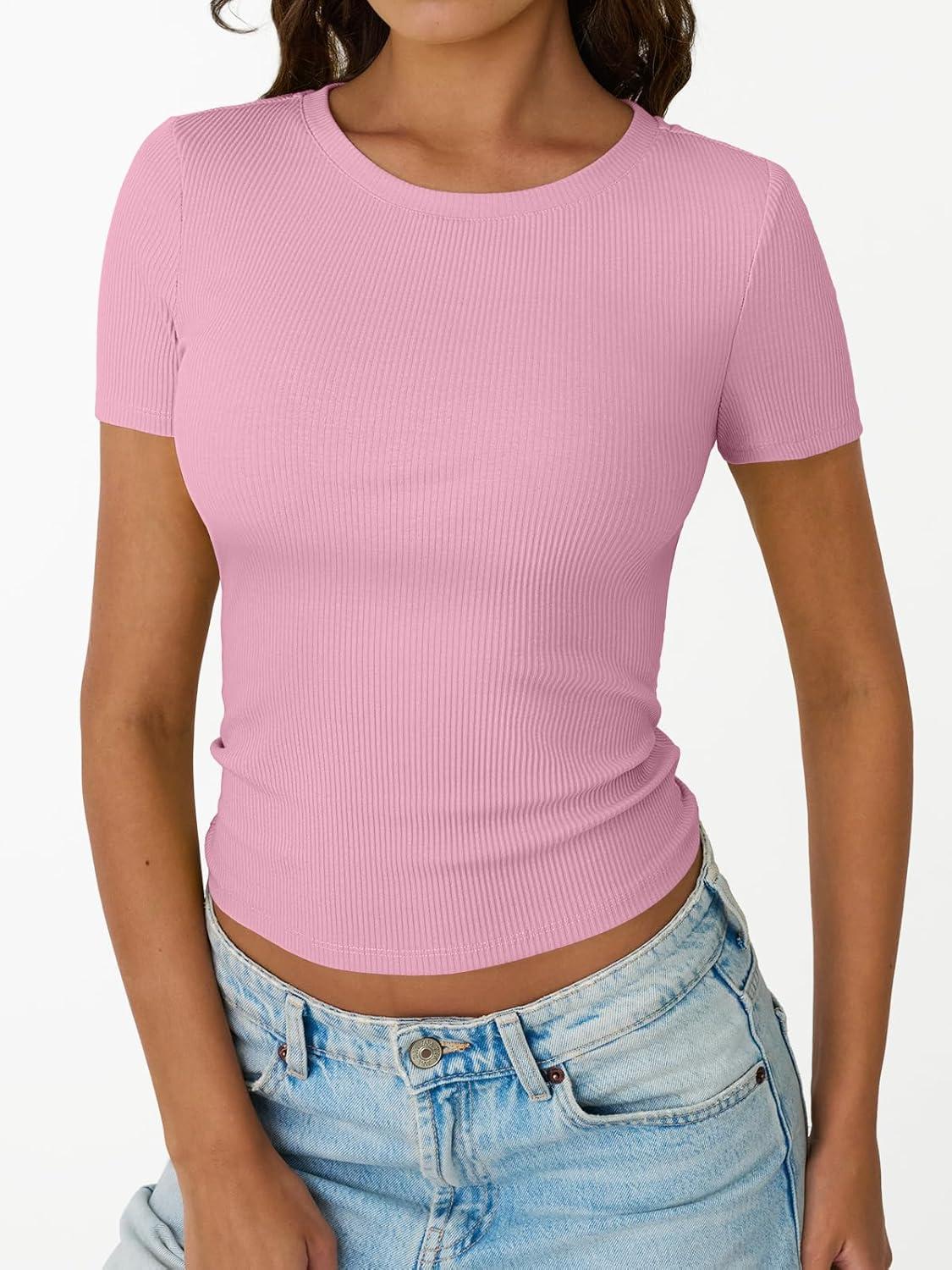 Trendy Queen Womens Short Sleeve Shirts Crewneck Ribbed Knit Slim Fitted T-Shirt Summer Basic Tee 2025 Tops(Pink)