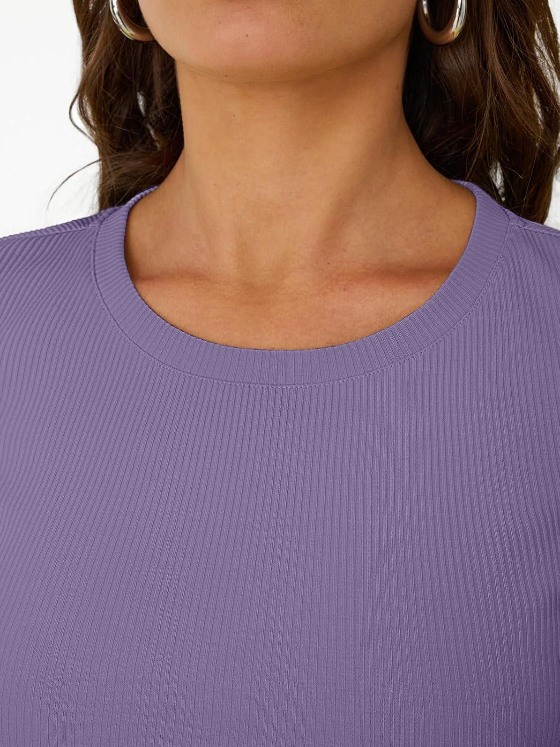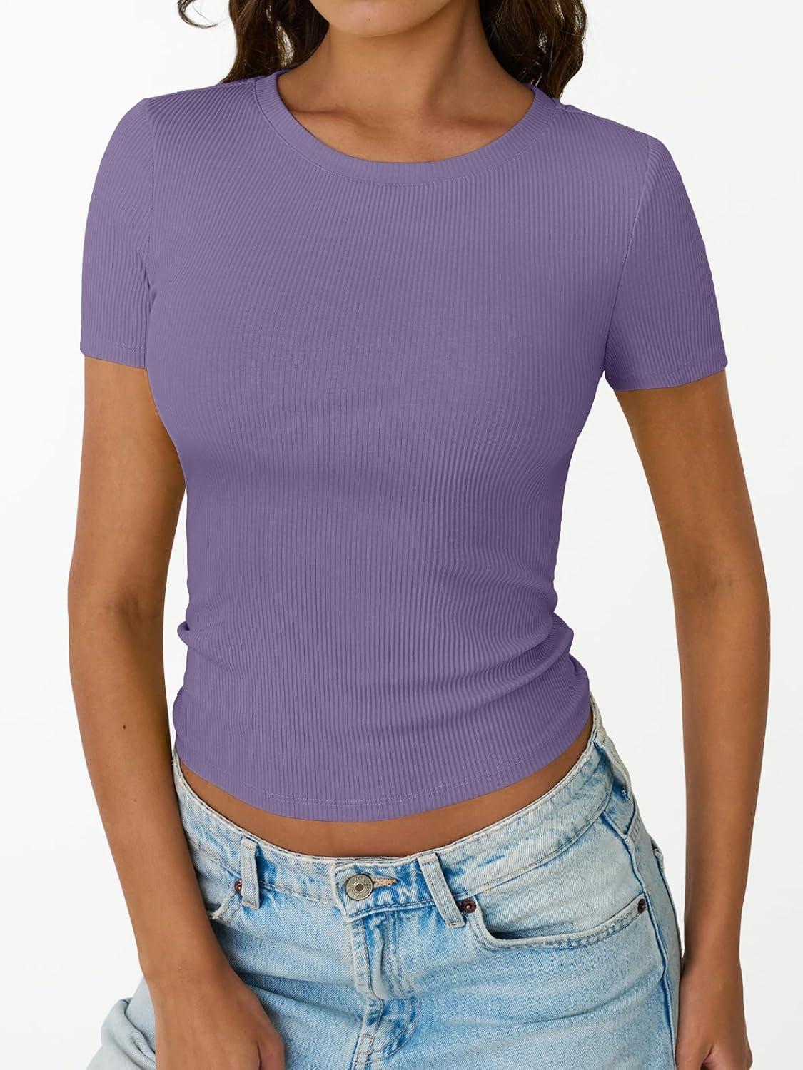 Trendy Queen Womens Short Sleeve Shirts Crewneck Ribbed Knit Slim Fitted T-Shirt Summer Basic Tee 2025 Tops(Purple)