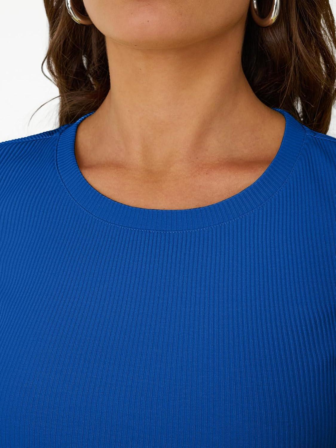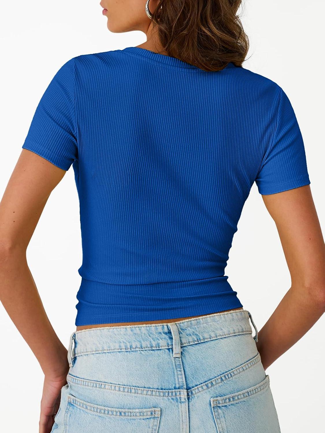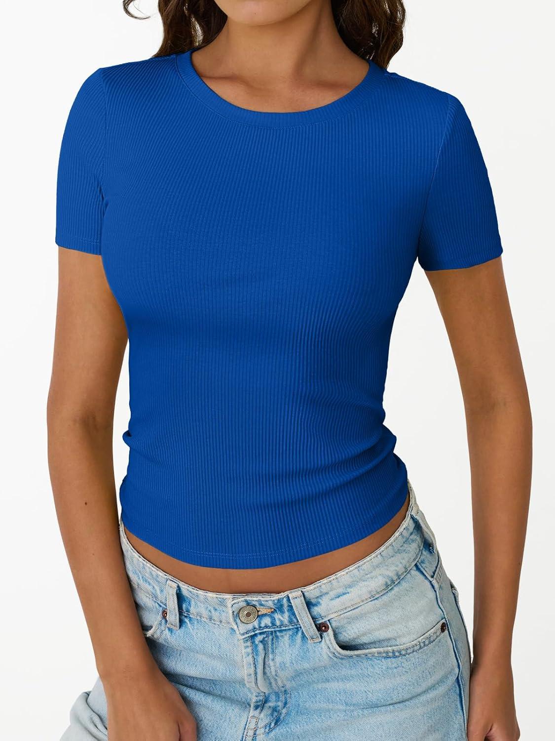 Trendy Queen Womens Short Sleeve Shirts Crewneck Ribbed Knit Slim Fitted T-Shirt Summer Basic Tee 2025 Tops(Royal Blue)