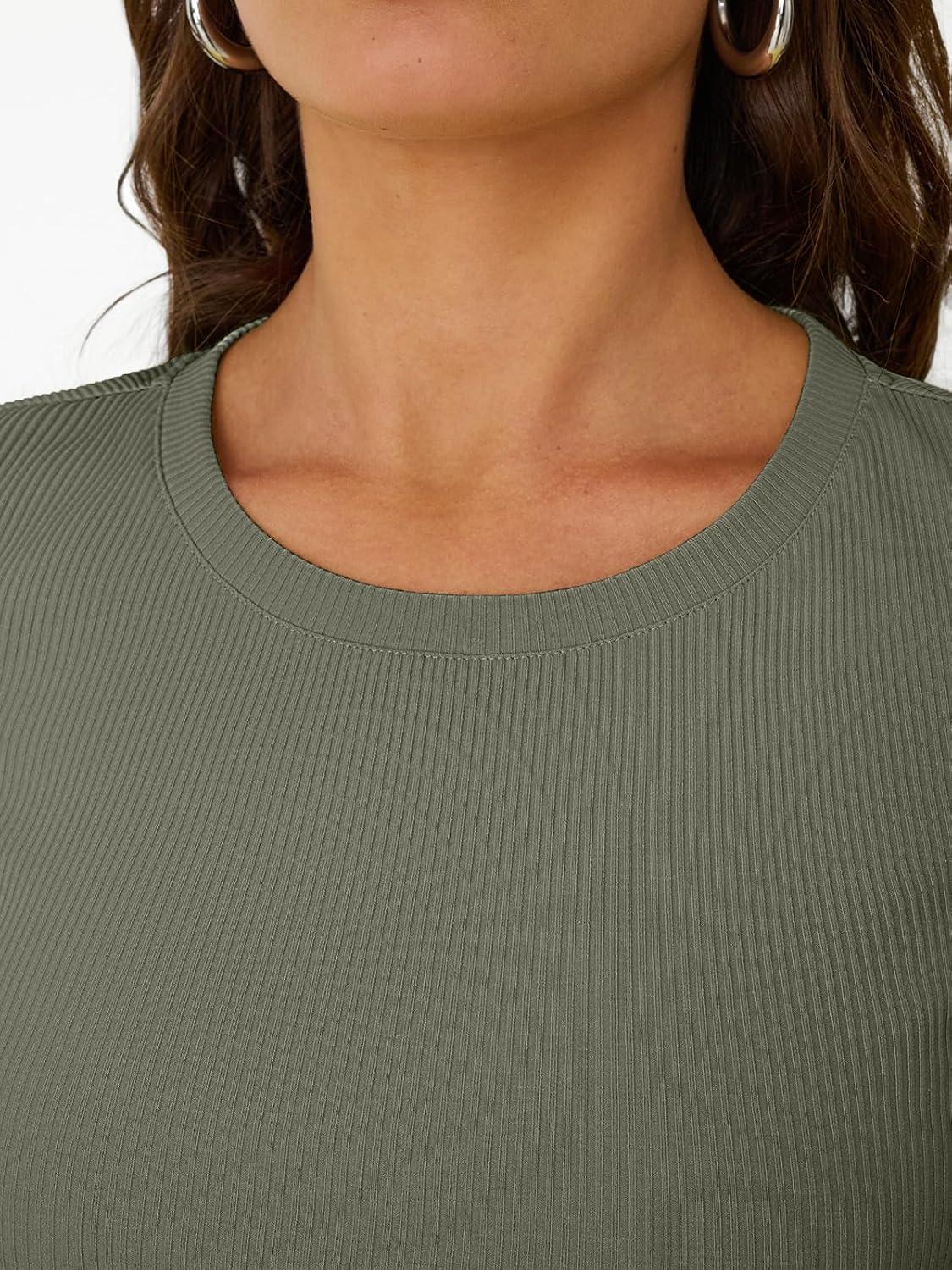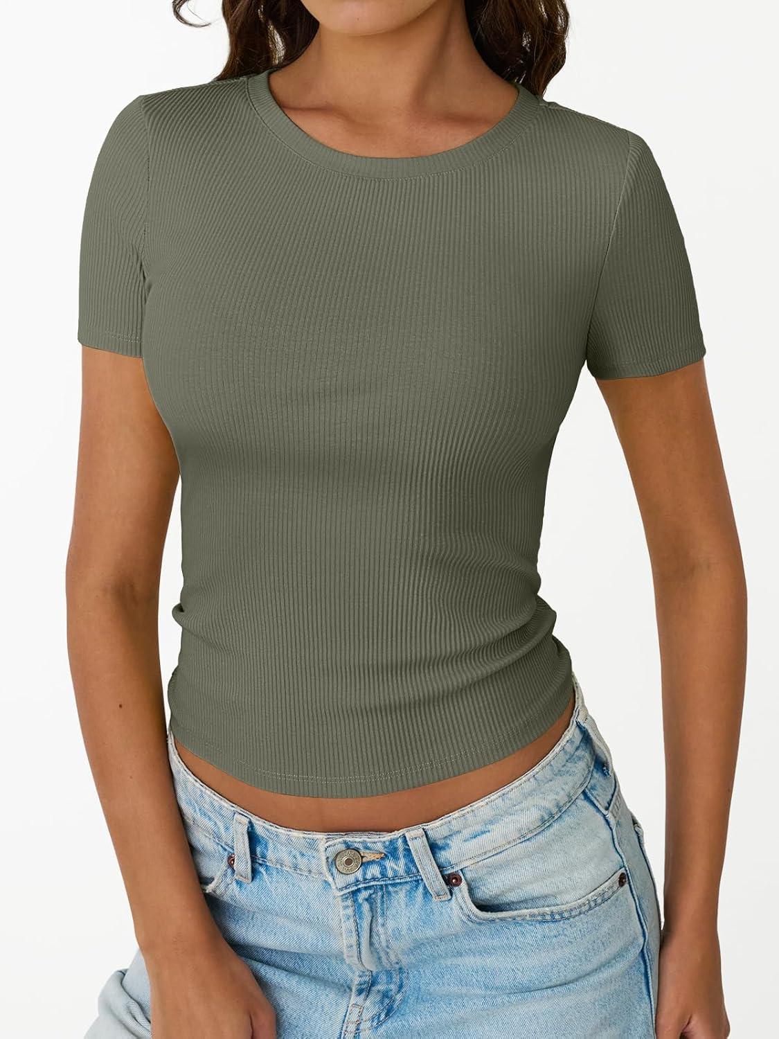 Trendy Queen Womens Short Sleeve Shirts Crewneck Ribbed Knit Slim Fitted T-Shirt Summer Basic Tee 2025 Tops(Sage Green)