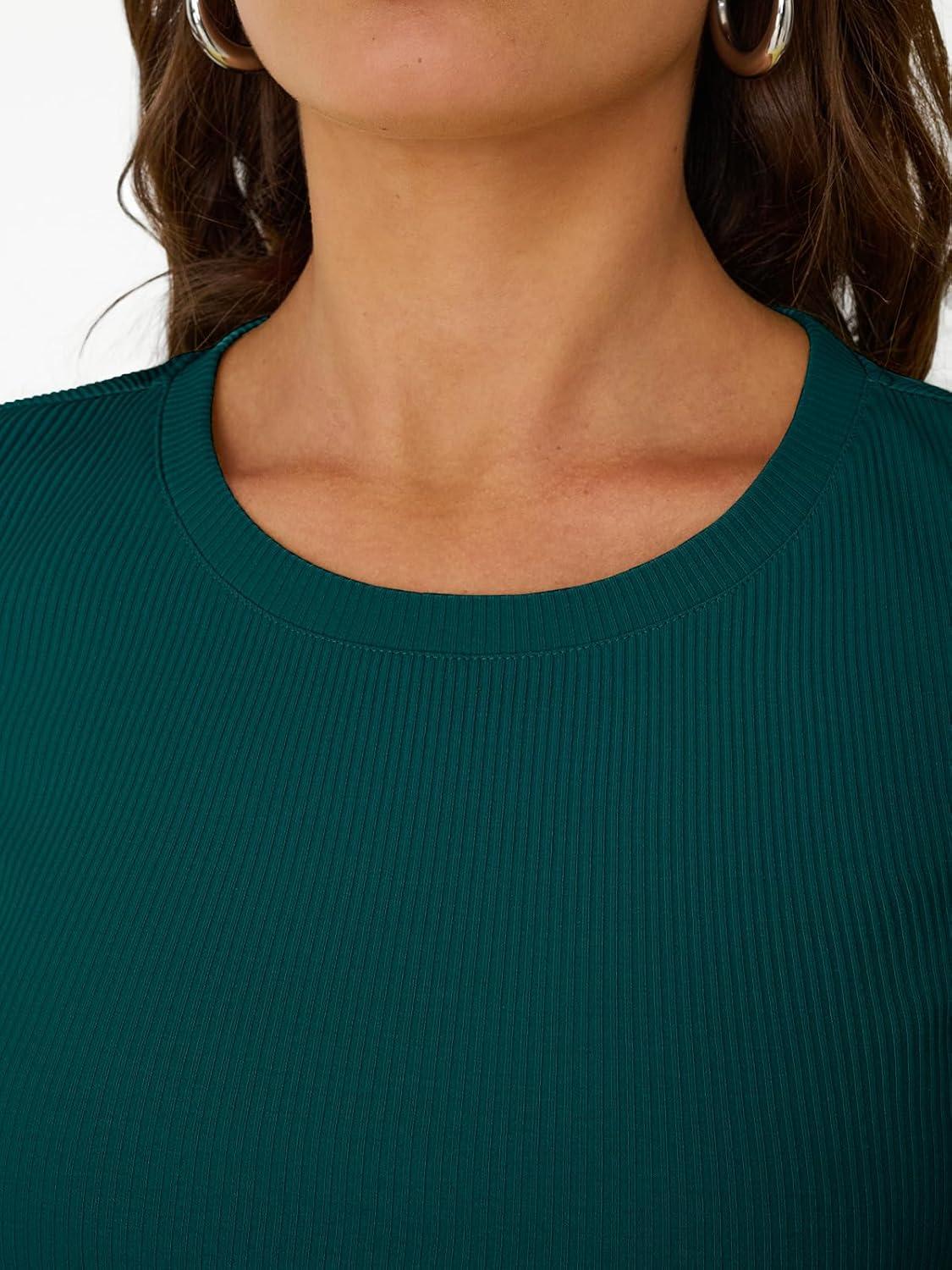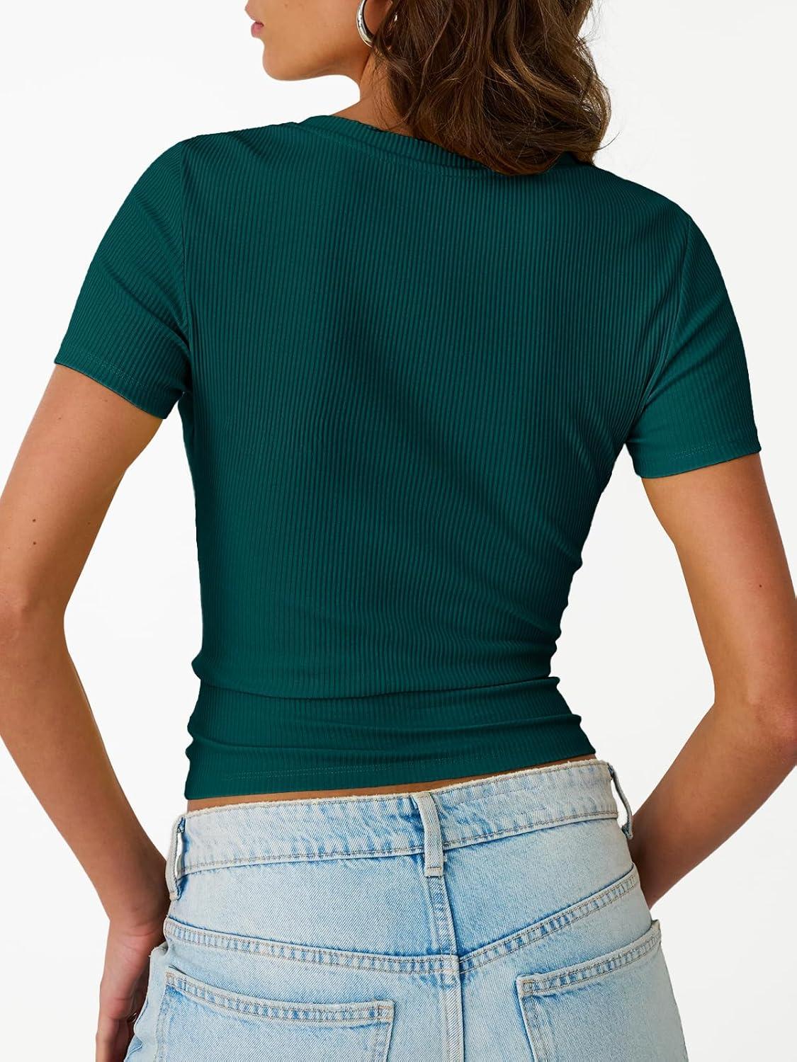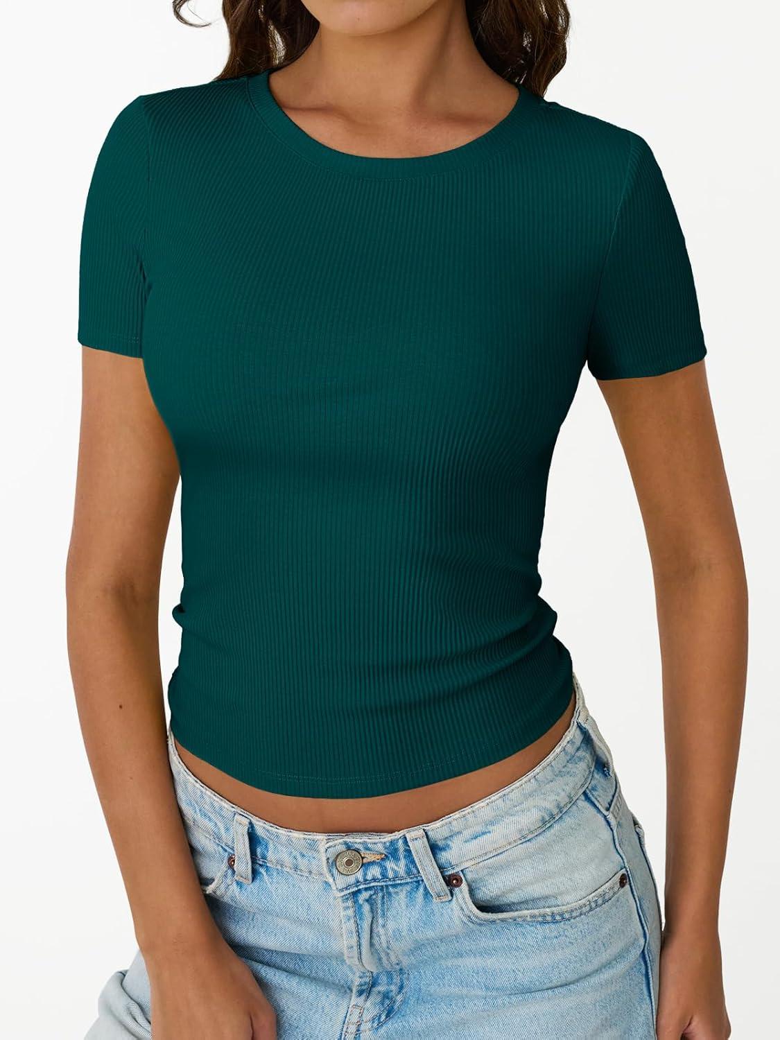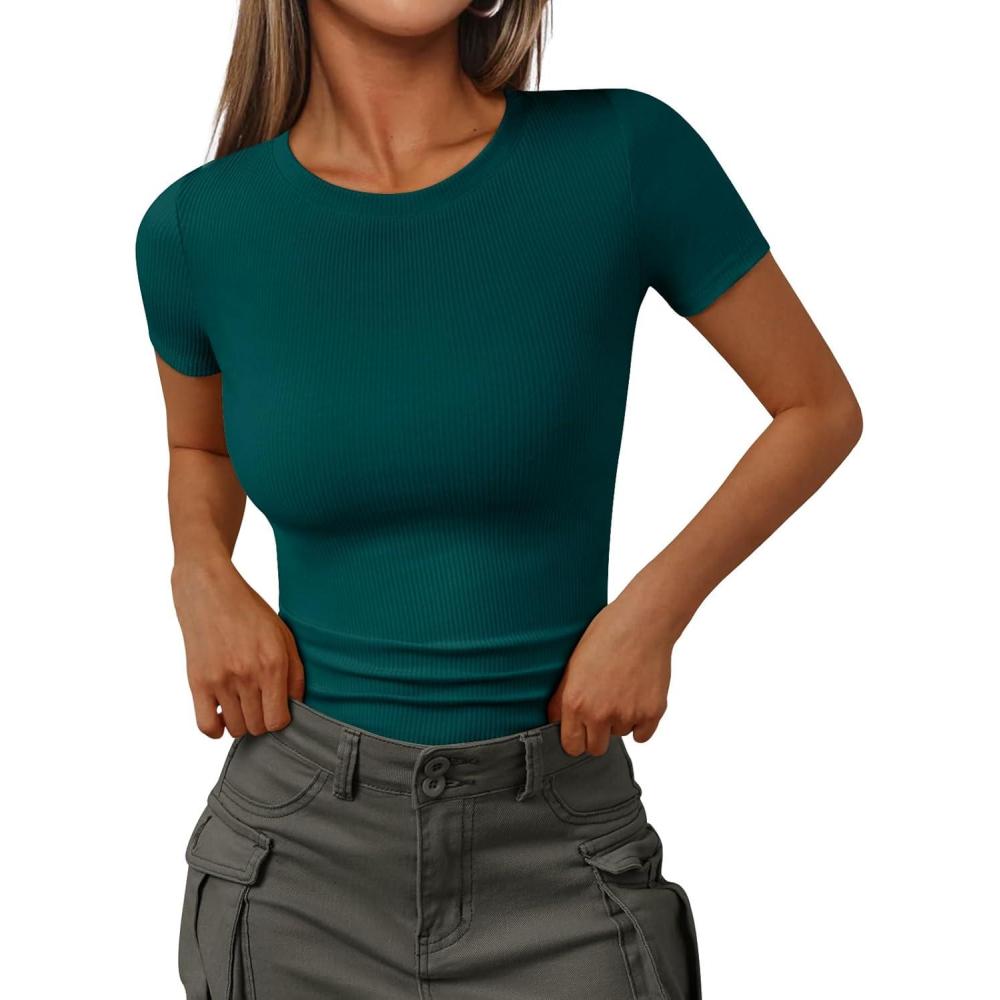 Trendy Queen Womens Short Sleeve Shirts Crewneck Ribbed Knit Slim Fitted T-Shirt Summer Basic Tee 2025 Tops(Teal)