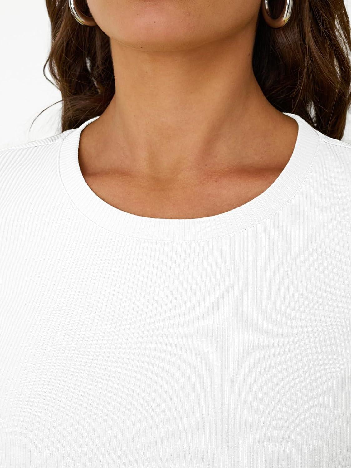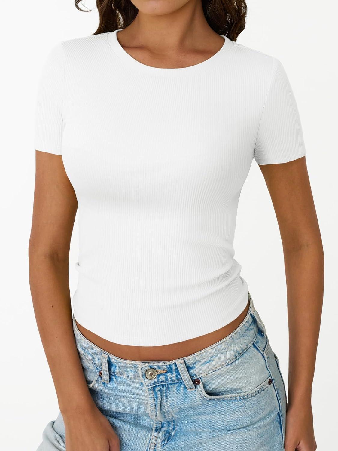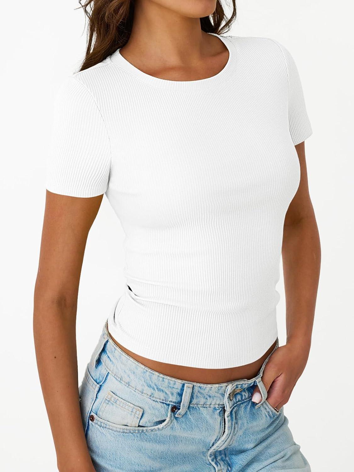 Trendy Queen Womens Short Sleeve Shirts Crewneck Ribbed Knit Slim Fitted T-Shirt Summer Basic Tee 2025 Tops(White)