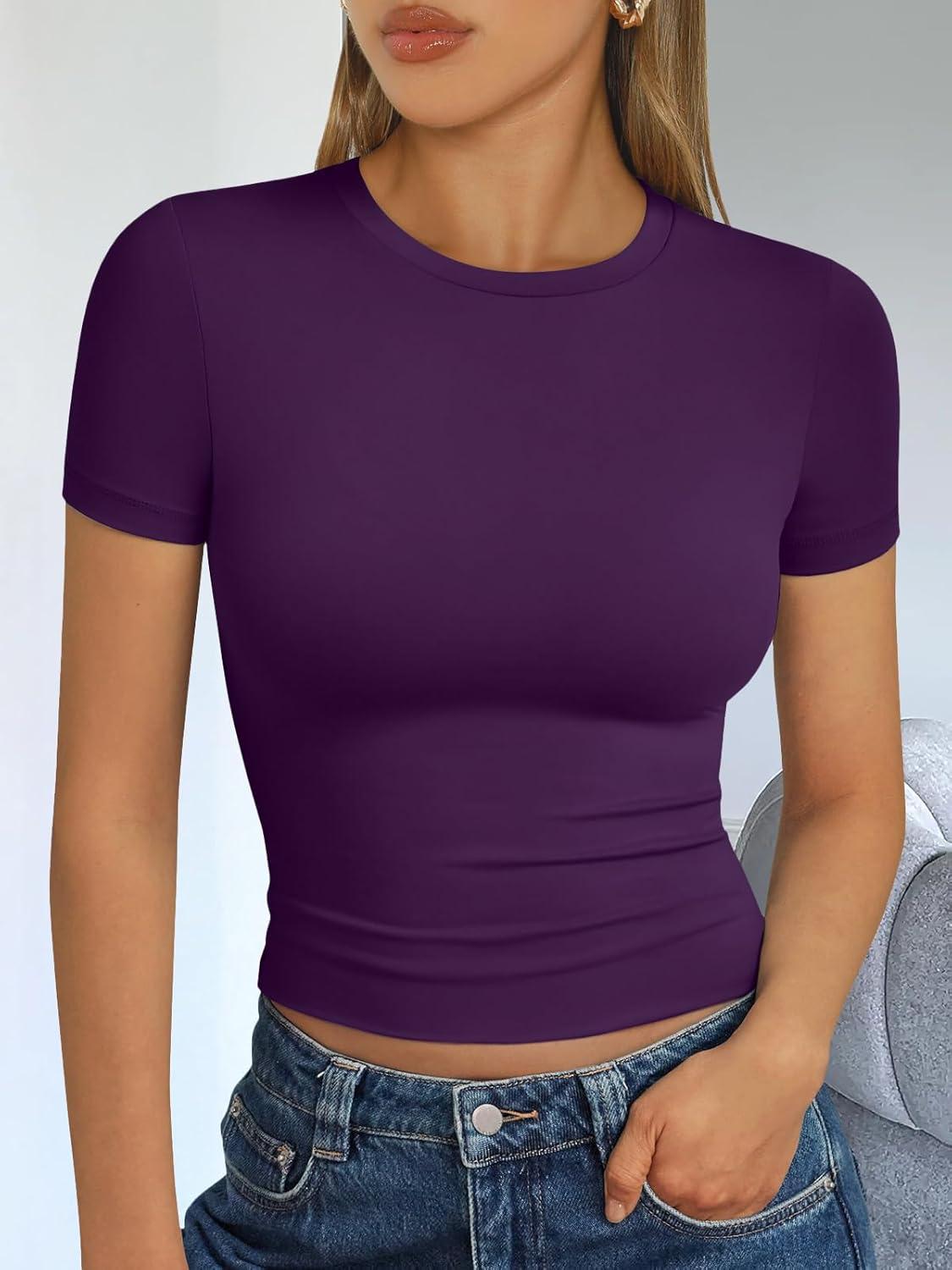 Trendy Queen Womens Short Sleeve T Shirts Summer Crop Tops Basic Slim Fit Gym Workout Y2k Clothes(Deep Purple)