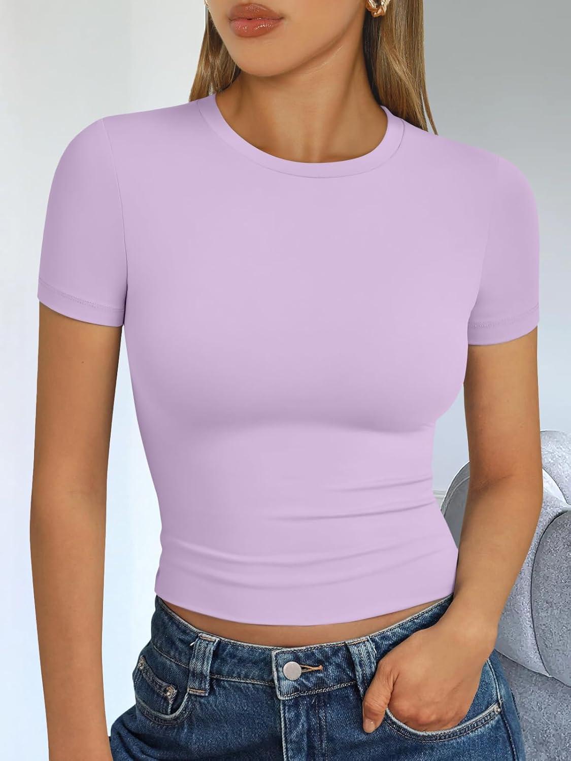 Trendy Queen Womens Short Sleeve T Shirts Summer Crop Tops Basic Slim Fit Gym Workout Y2k Clothes(Purple)