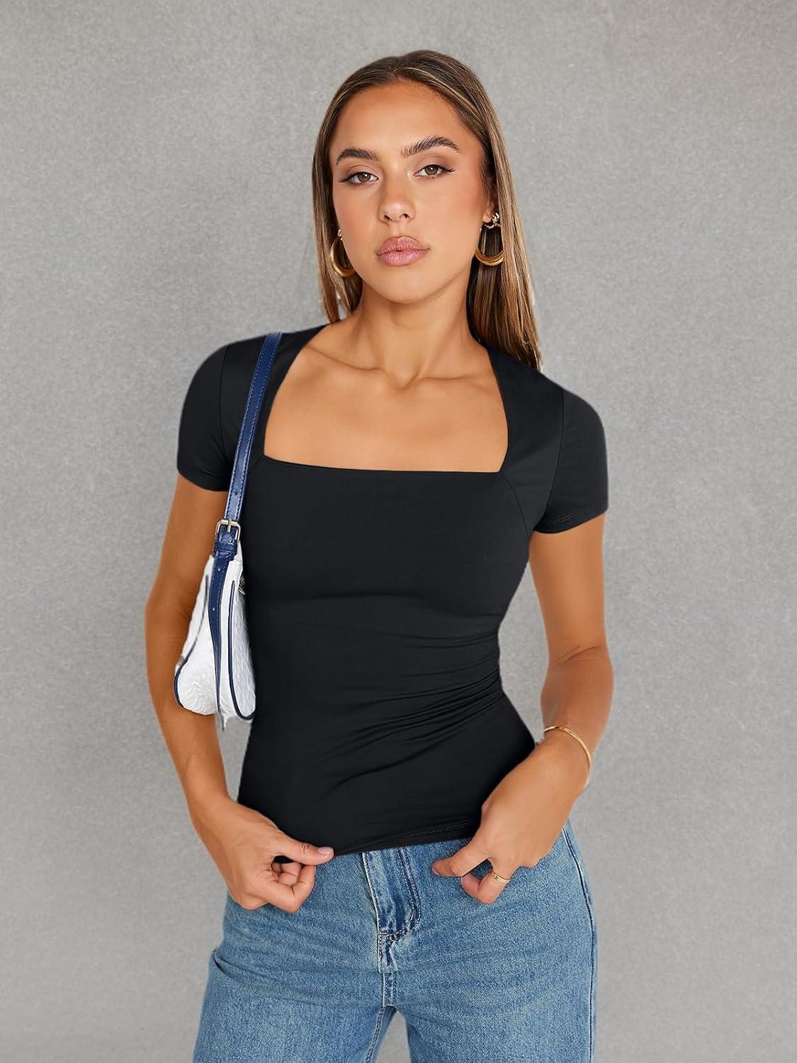 Trendy Queen Women’s Square Neck Tops Short Sleeve Shirts Double Lined Workout Summer Clothes Casual Slim Fit T-Shirts(Black)