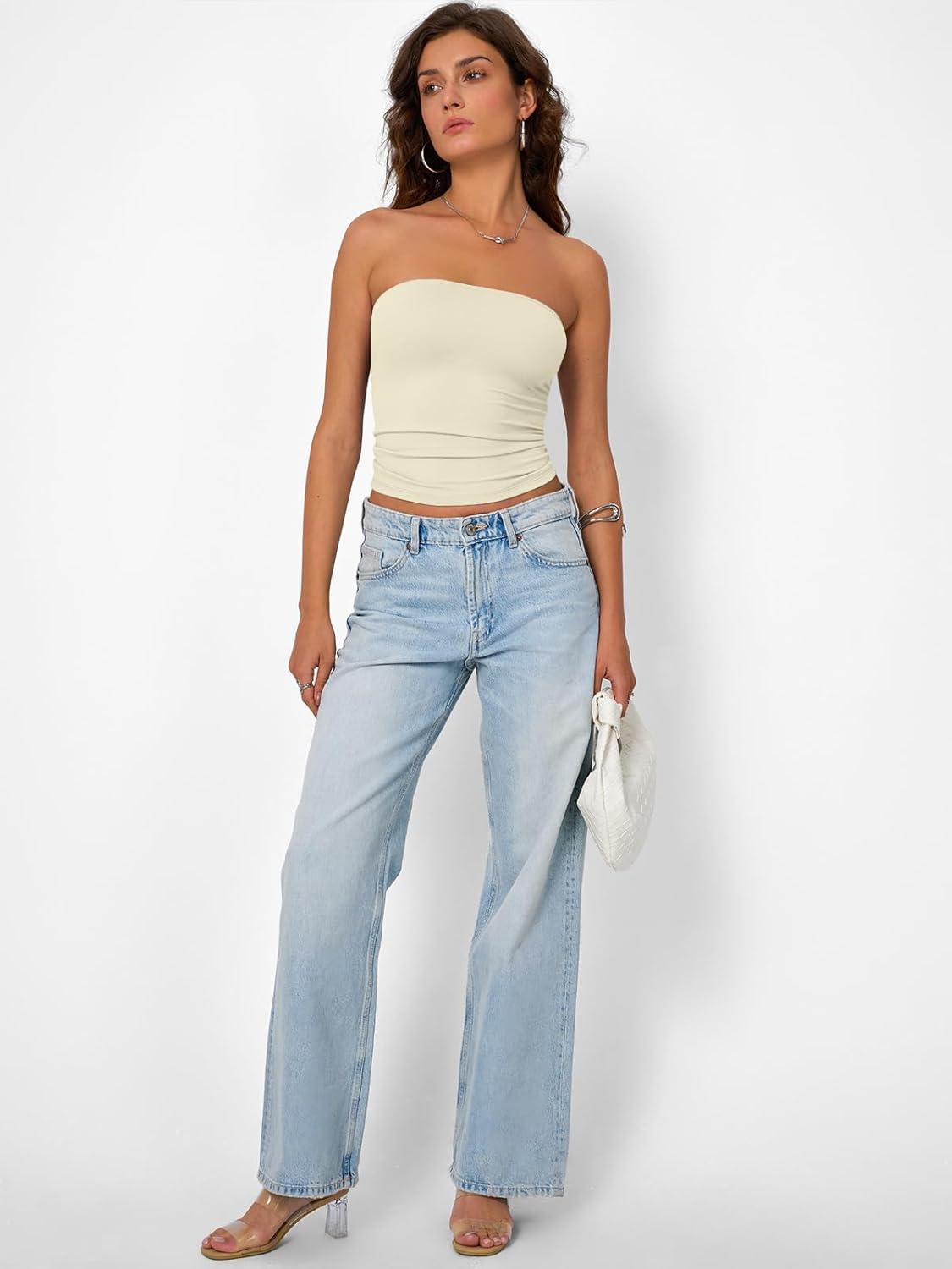 Trendy Queen Womens Strapless Tube Tops Basic Backless Sleeveless Bandeau Going Out Crop Tops Cute 2025 Summer Clothes(Khaki)