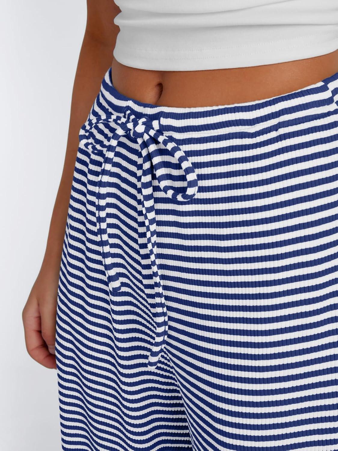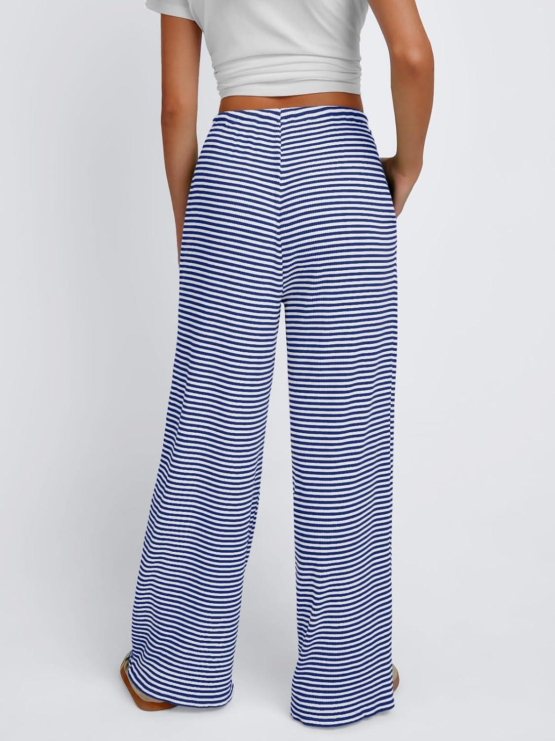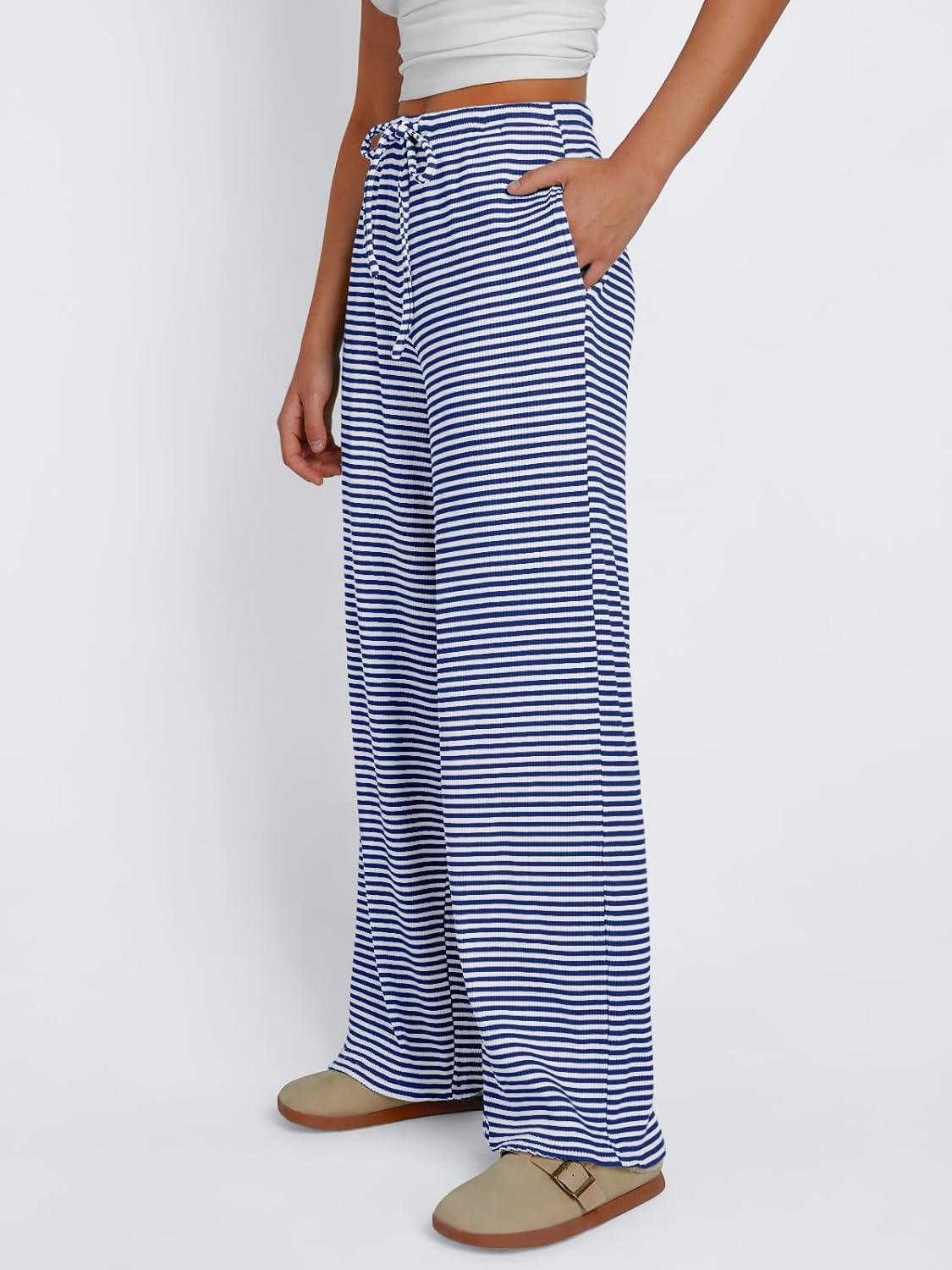 Trendy Queen Womens Striped Ribbed Wide Leg Pants Casual Drawstring Elastic Waist Baggy Sweatpants with Pockets(Blue White)