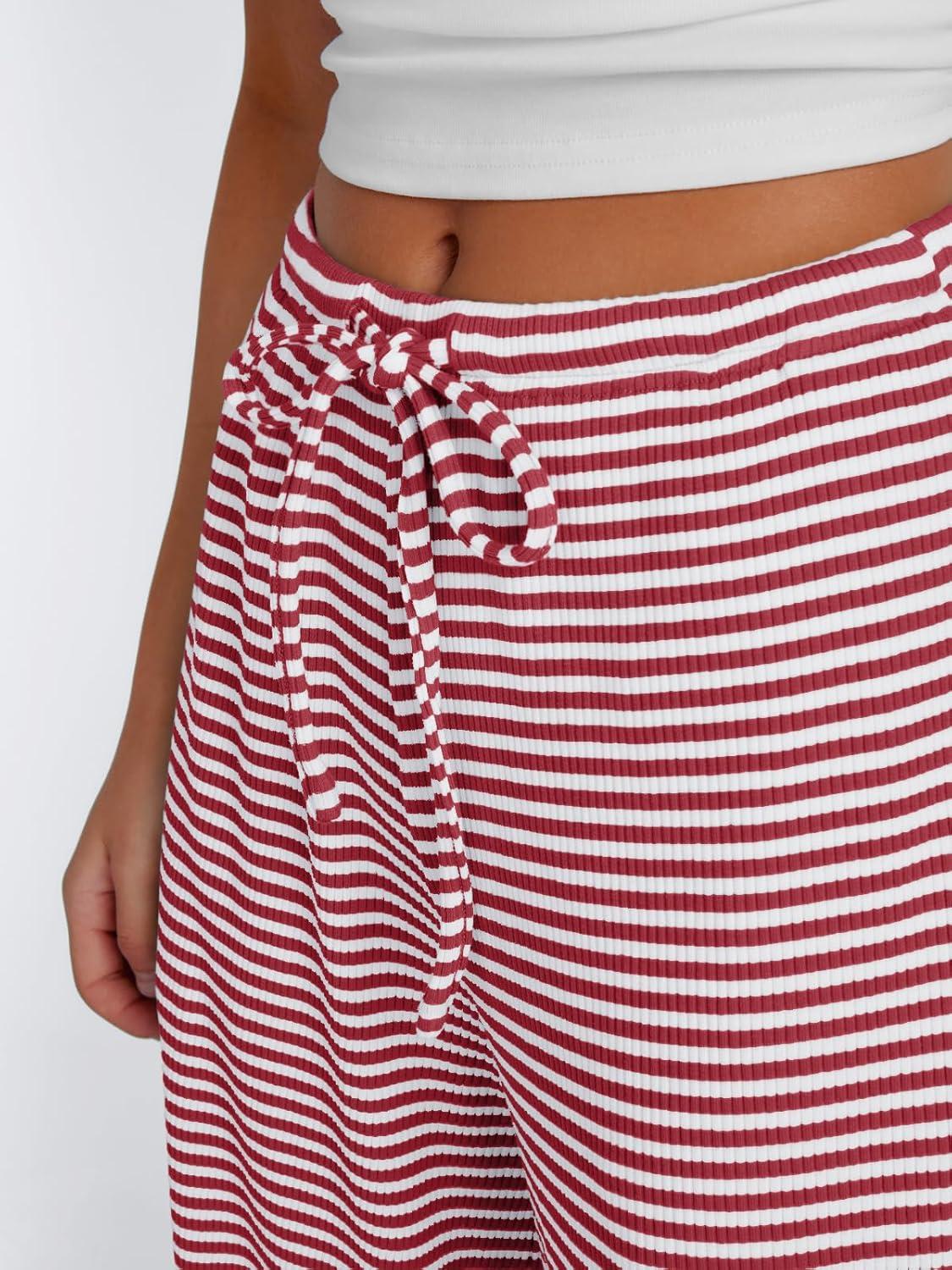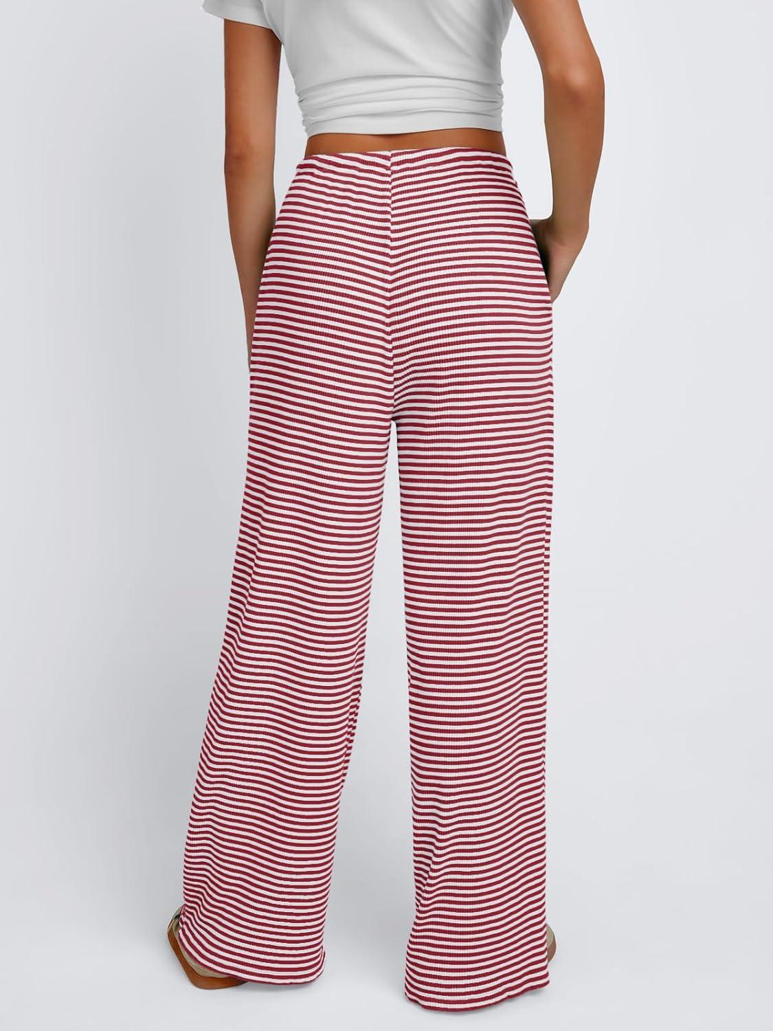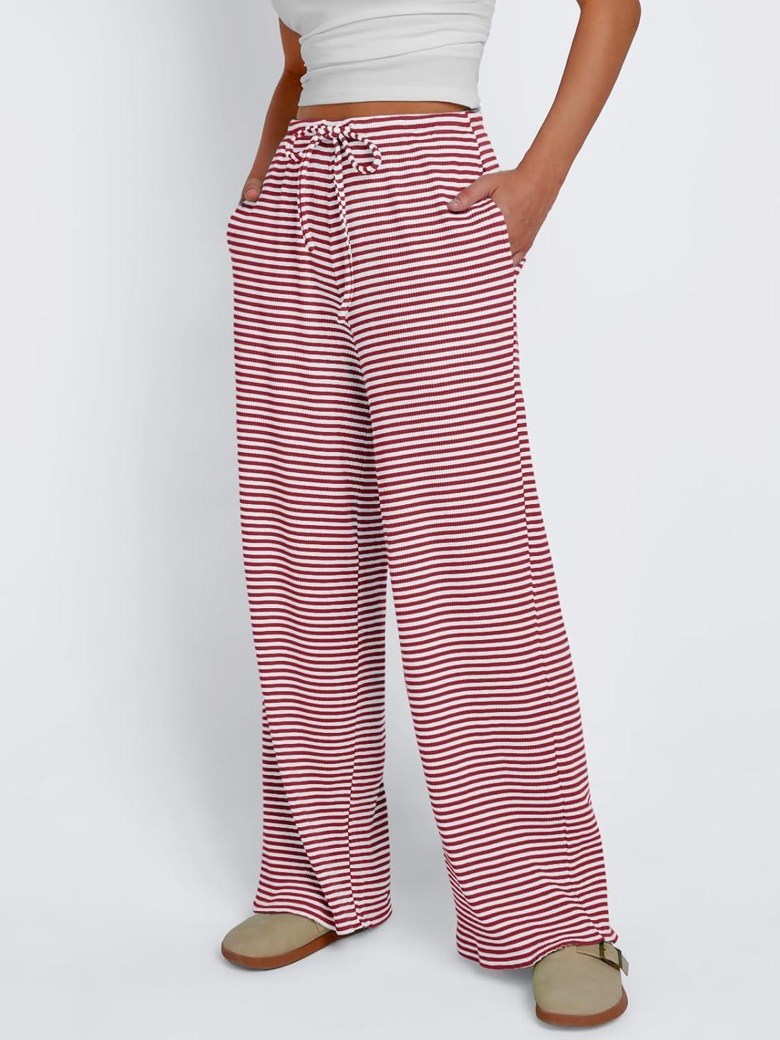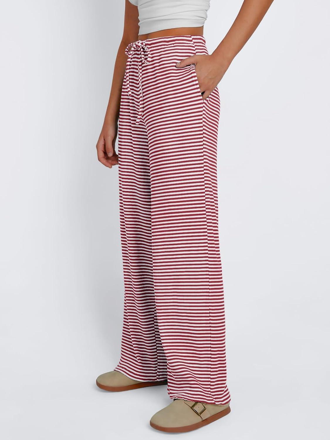 Trendy Queen Womens Striped Ribbed Wide Leg Pants Casual Drawstring Elastic Waist Baggy Sweatpants with Pockets(Red White)