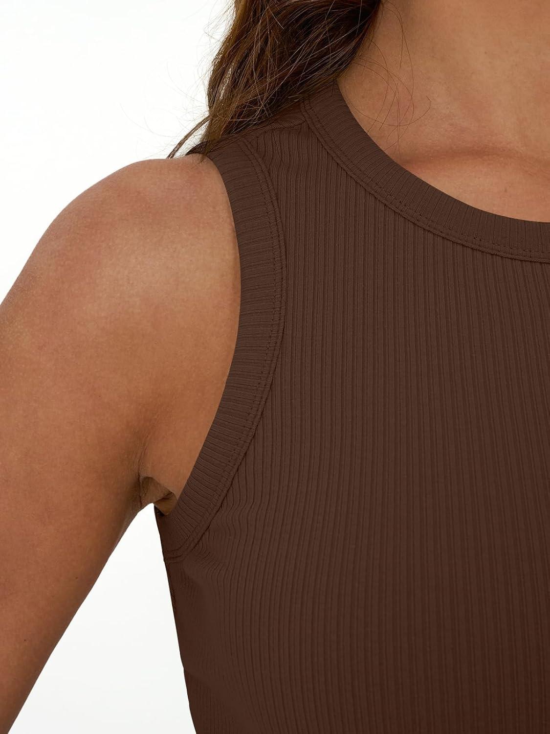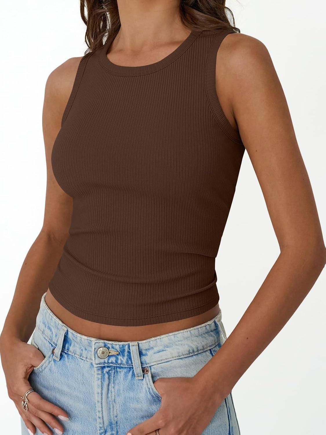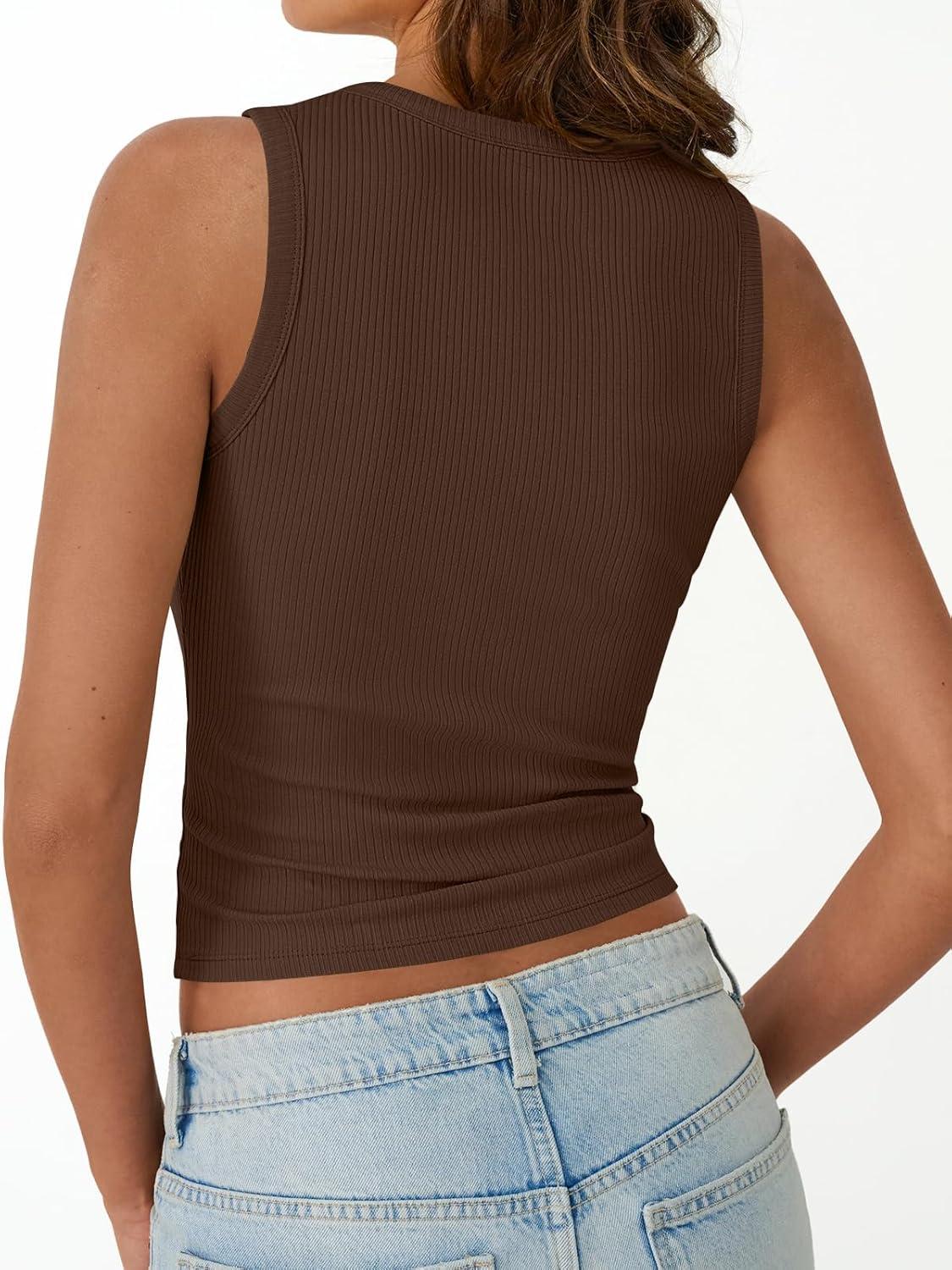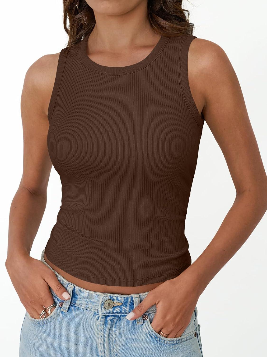 Trendy Queen Womens Tank Tops Summer Fashion 2025 Workout Ribbed Sleeveless High Neck Beach Vacation Oufits Clothes(Brown)