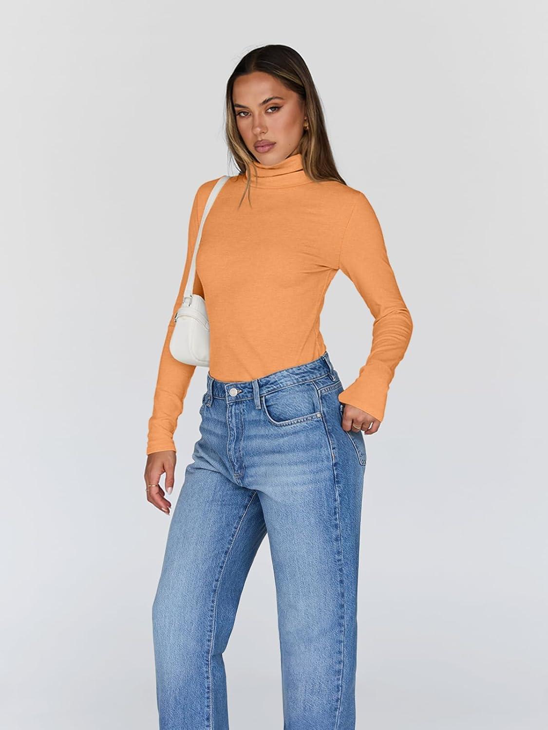 Trendy Queen Women’s Turtleneck Long Sleeve Shirts Fall Fashion Basic Thermal Underwear Tops Winter Clothes 2025(Orange)