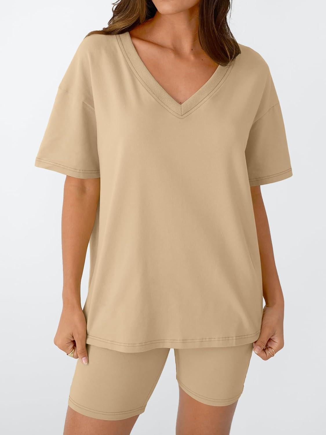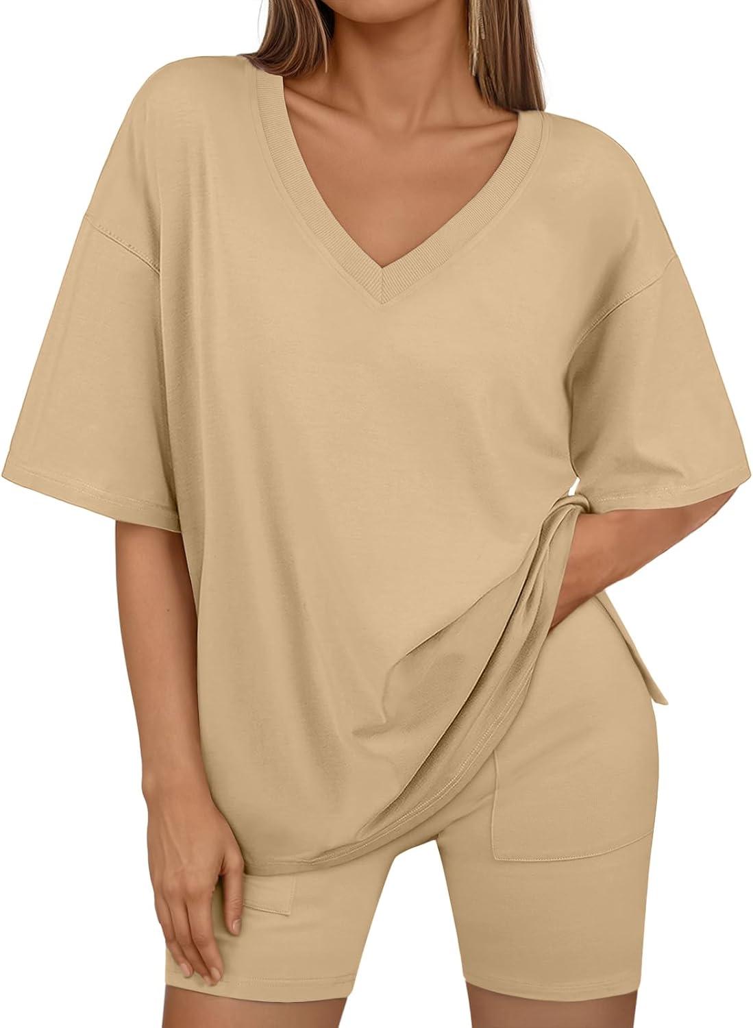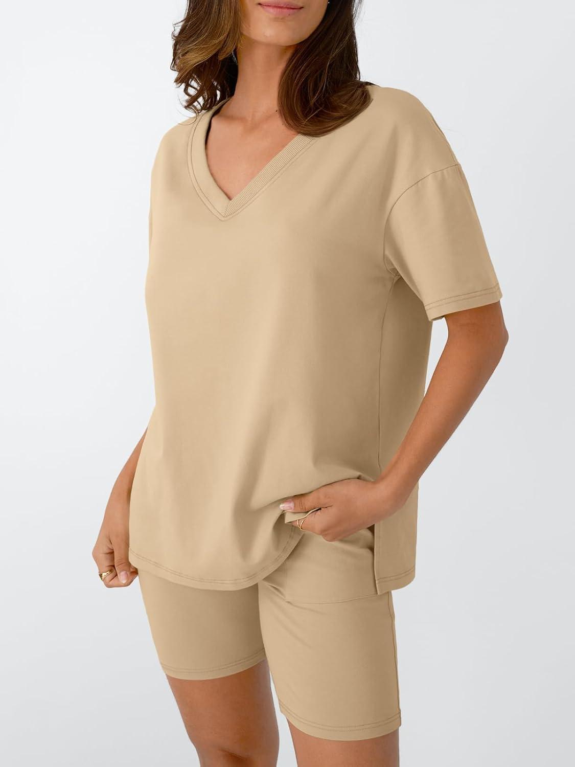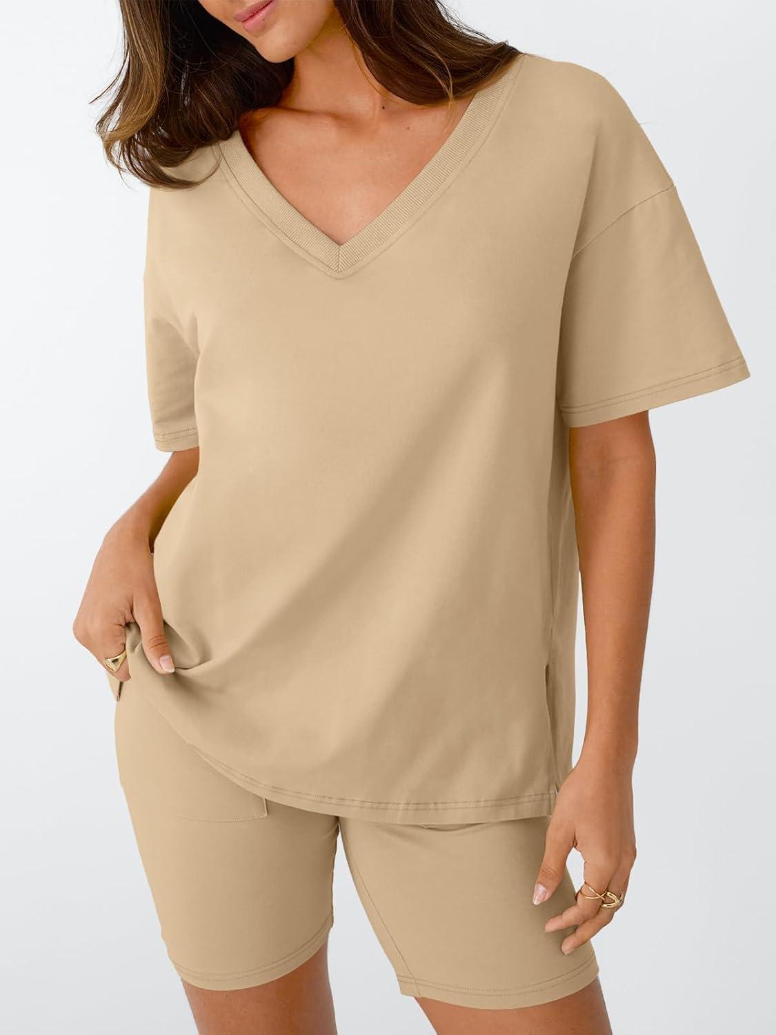 Trendy Queen Womens Two Piece Lounge Sets Summer Outfits 2025 Spring Fashion Vacation Tops Shorts Matching Tracksuits(Khaki)