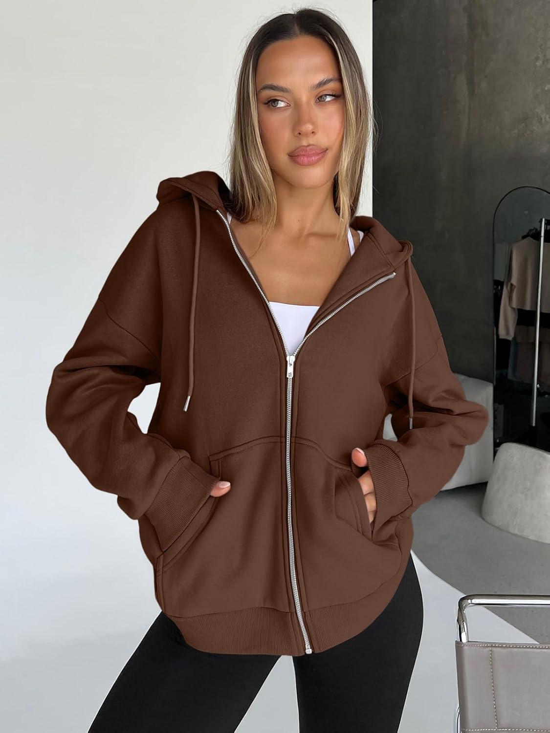 Trendy Queen Womens Zip Up Hoodies Oversized Sweatshirts Fall School Fashion Outfits Casual Jackets 2025 Winter Clothes(Coffee)