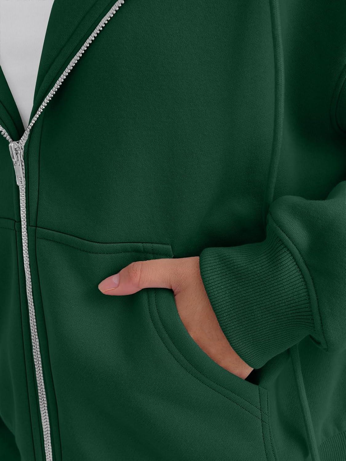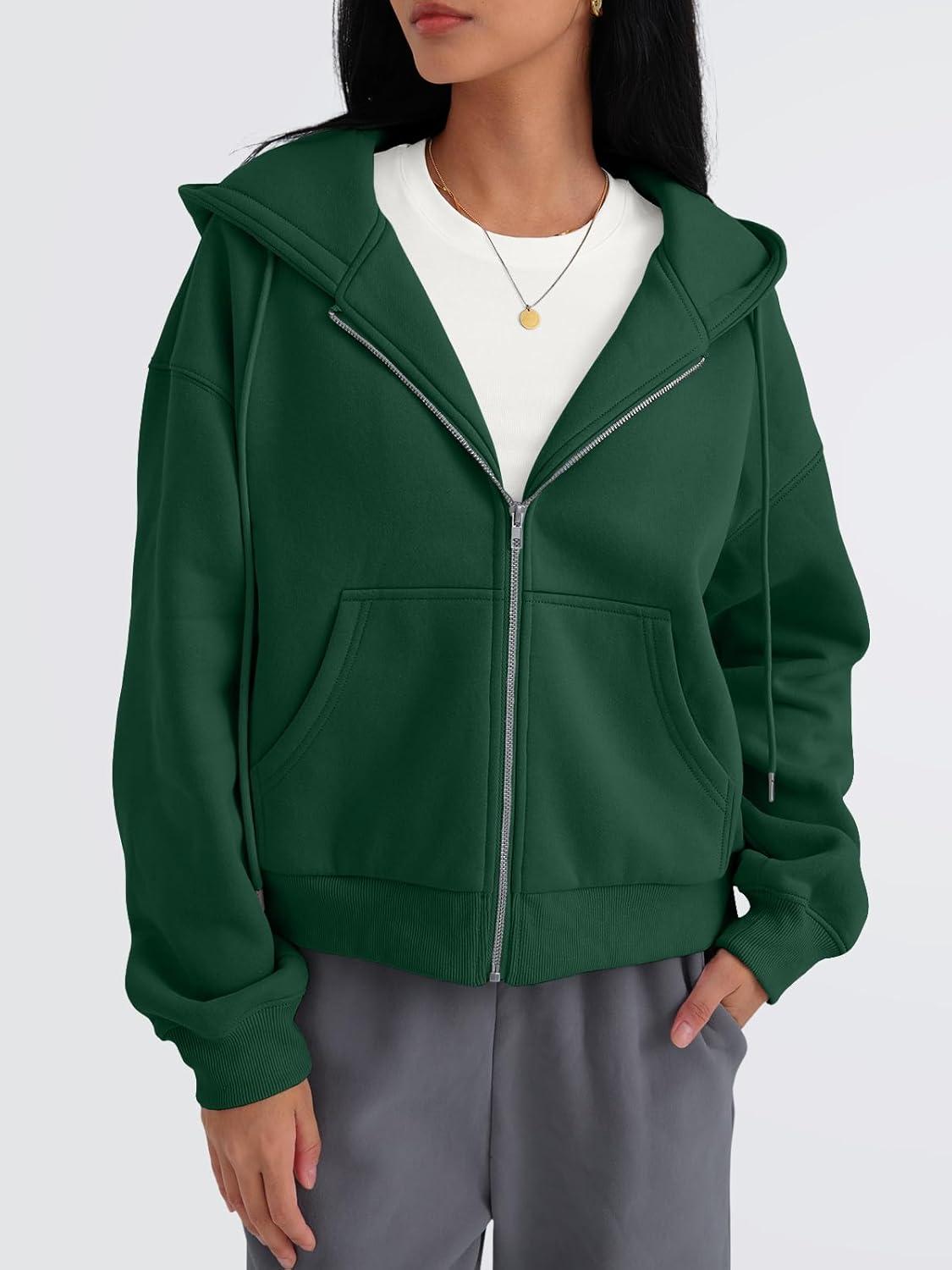 Trendy Queen Zip Up Hoodies For Women Cropped Sweatshirts Fall Fashion Outfits 2025 Y2k Fleece Teen Girls Clothes(Darkgreen)
